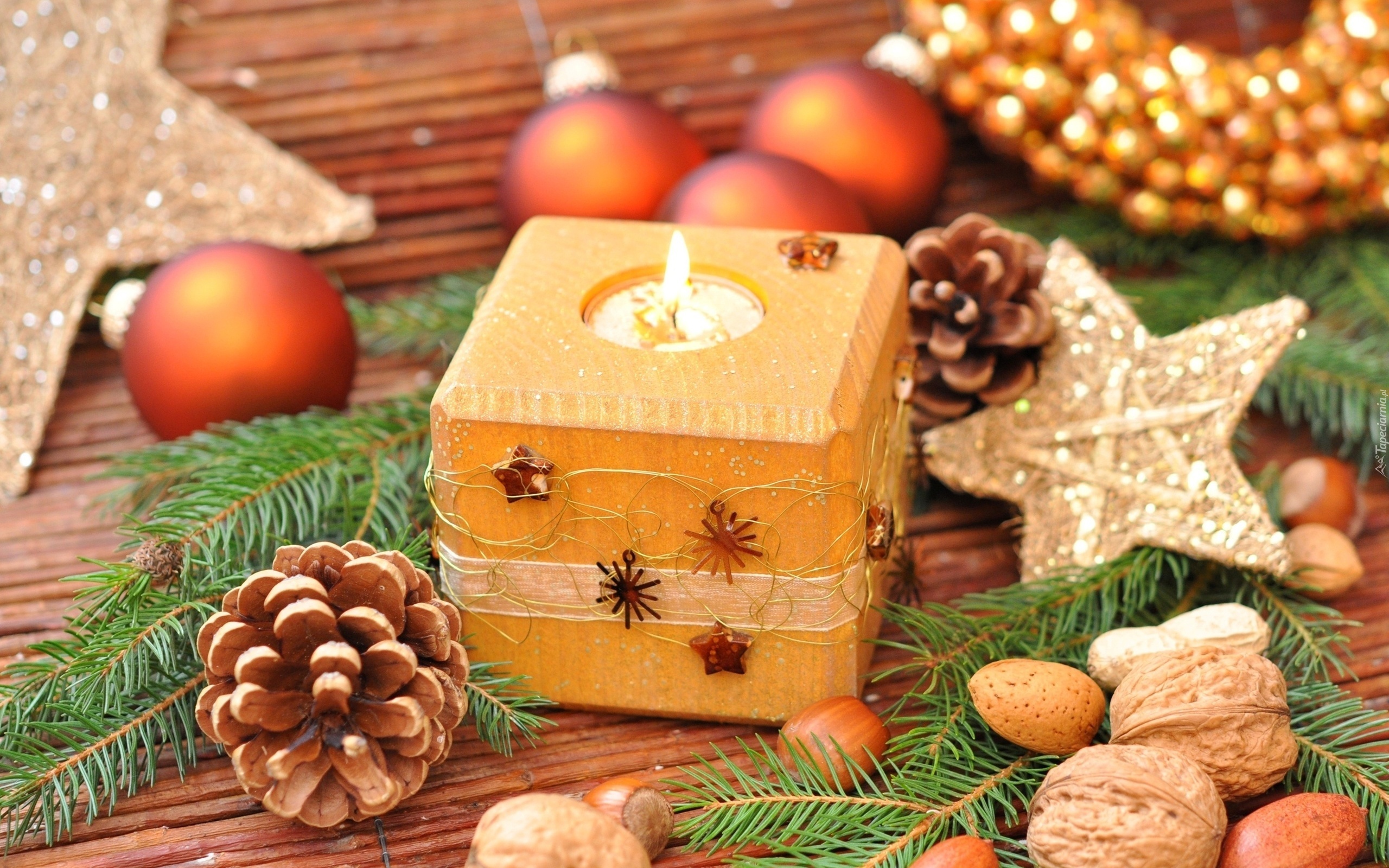 Edytor tapety: Świeca, Bombki, Gwiazdki, Szyszki, Świąteczna, Kompozycja