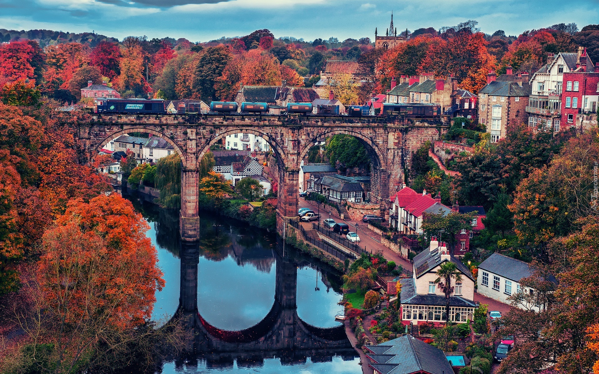 Edytor tapety: Miasteczko, Most, Rzeka, Jesień