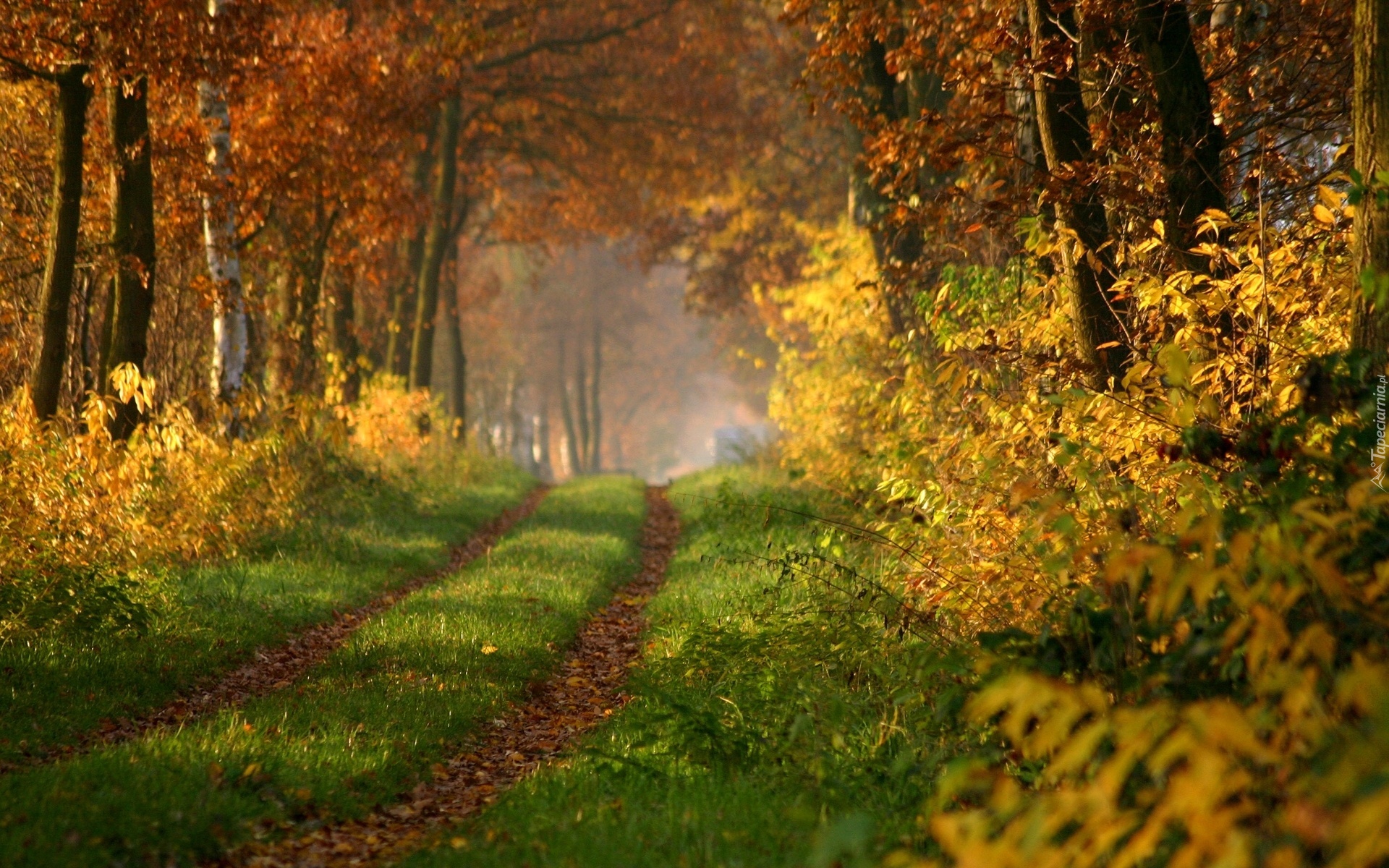 Edytor tapety: Las, Droga, Przebijające, Światło, Jesień