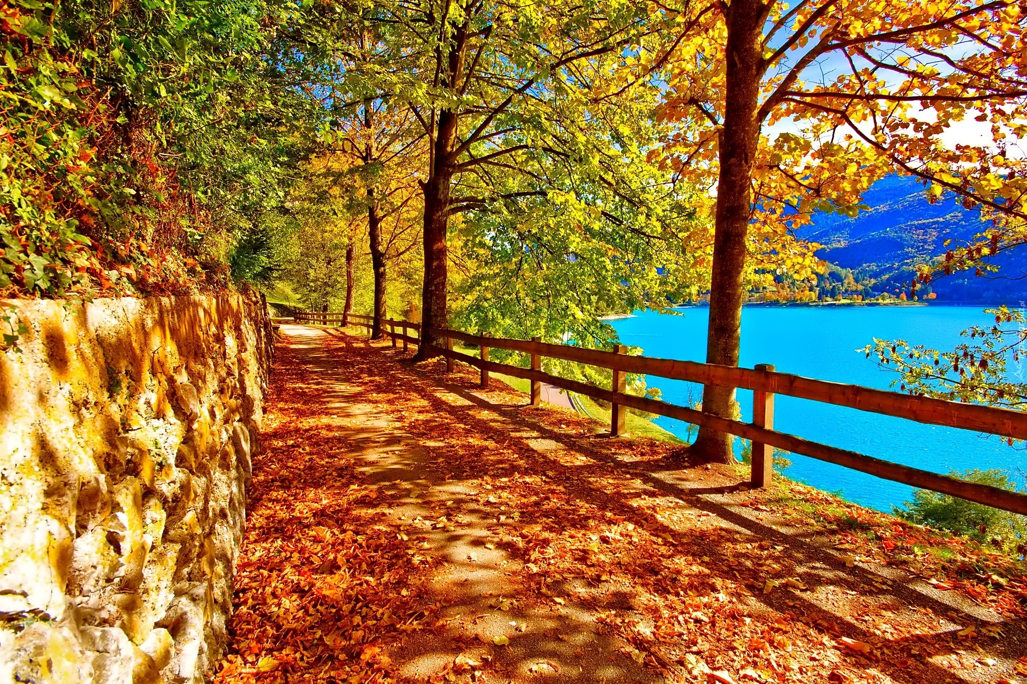 Edytor tapety: Droga, Drzewa, Jezioro, Jesień