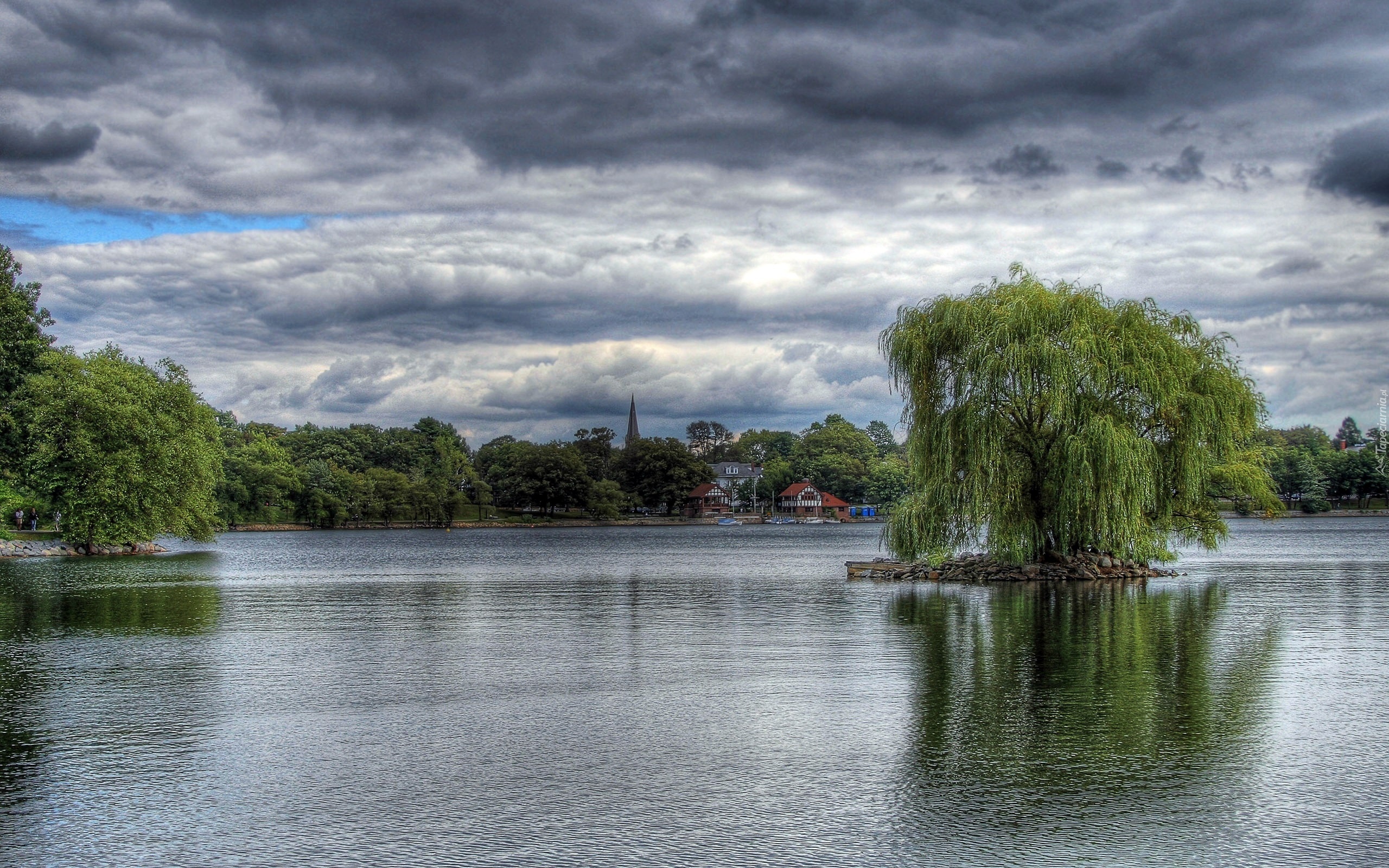 Edytor tapety: Jezioro, Chmury, Drzewa, Budynki