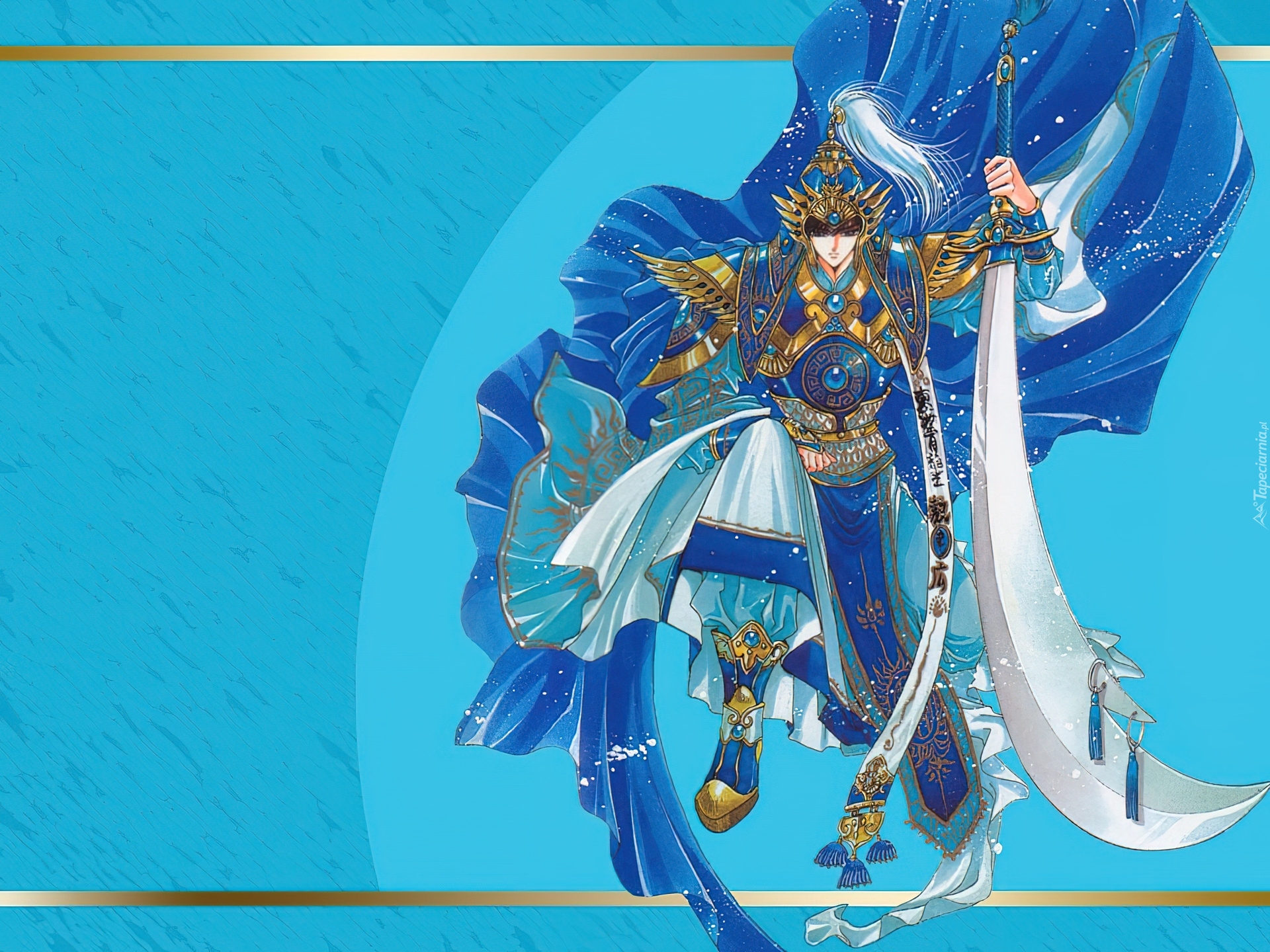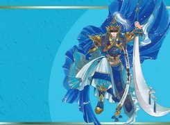 Edytor tapety: Soryuden, niebiesko złoty strój, miecz
