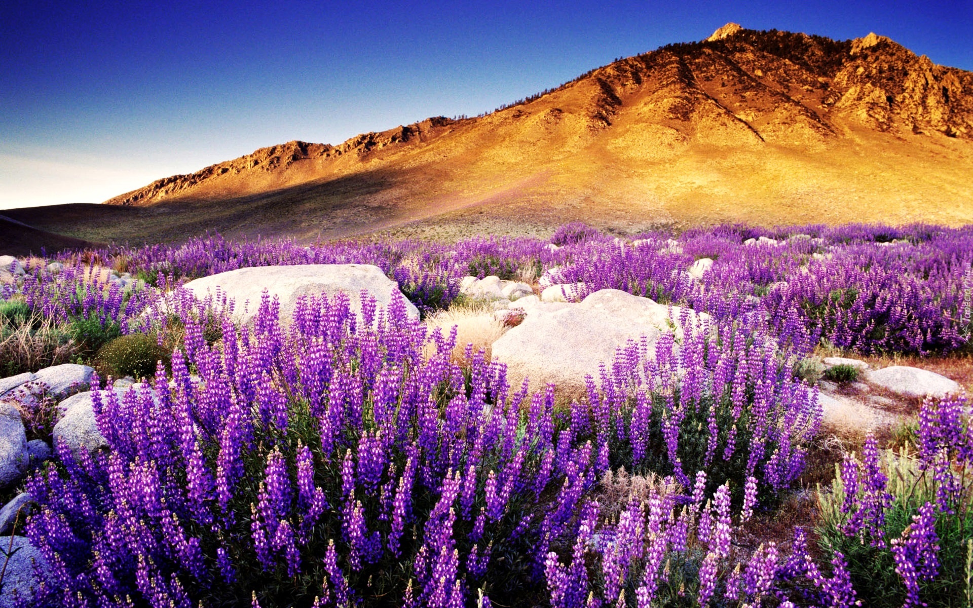 Edytor tapety: Zachód, Słońca, Wzgórza, Głazy, Kwitnący, Łubin