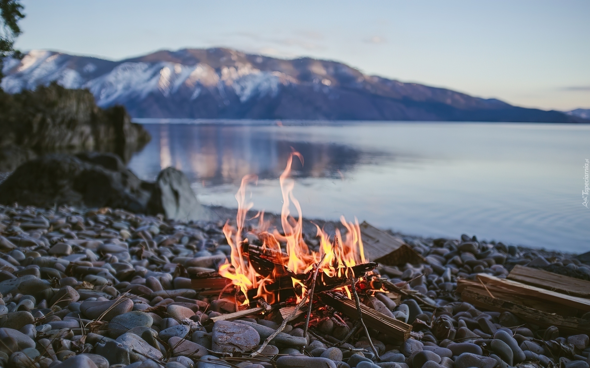 Edytor tapety: Morze, Góry, Kamienie, Ognisko