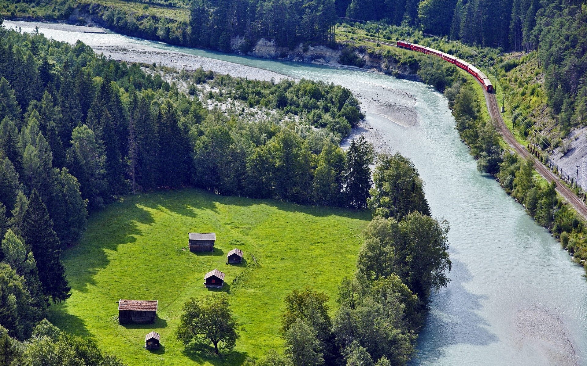 Edytor tapety: Rzeka, Lasy, Łąka, Domy