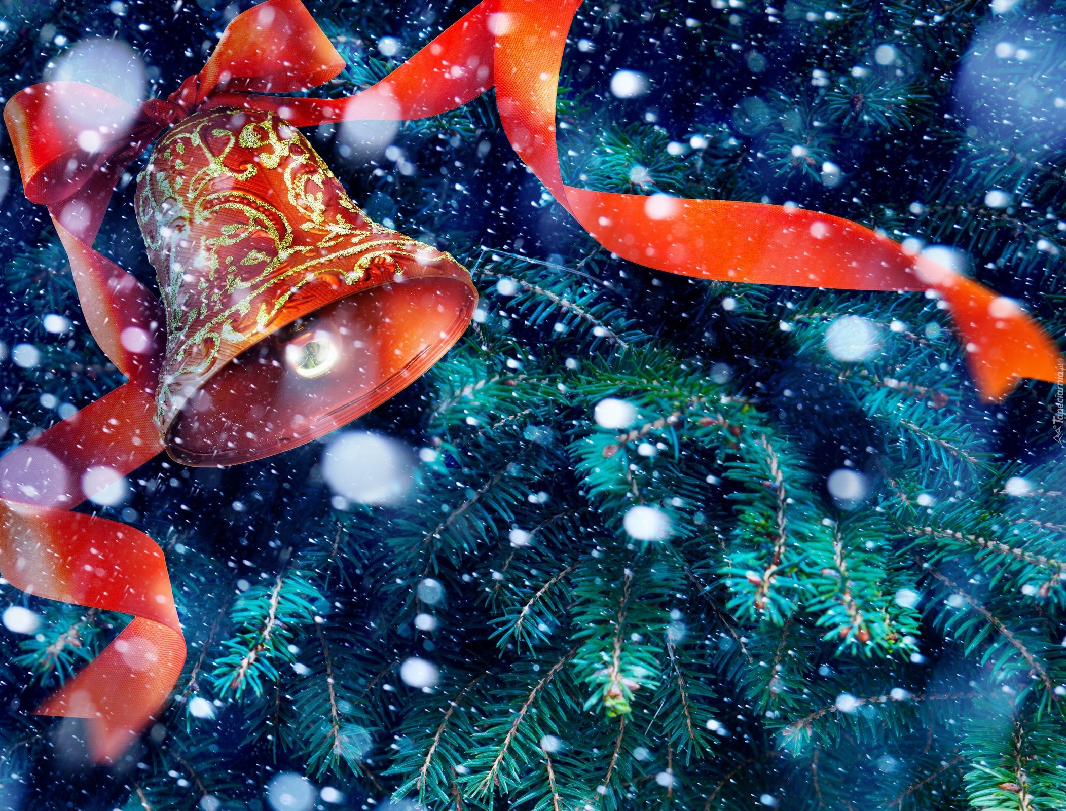 Edytor tapety: Świąteczny, Dzwonek, Gałązki, Świerku, Śnieg