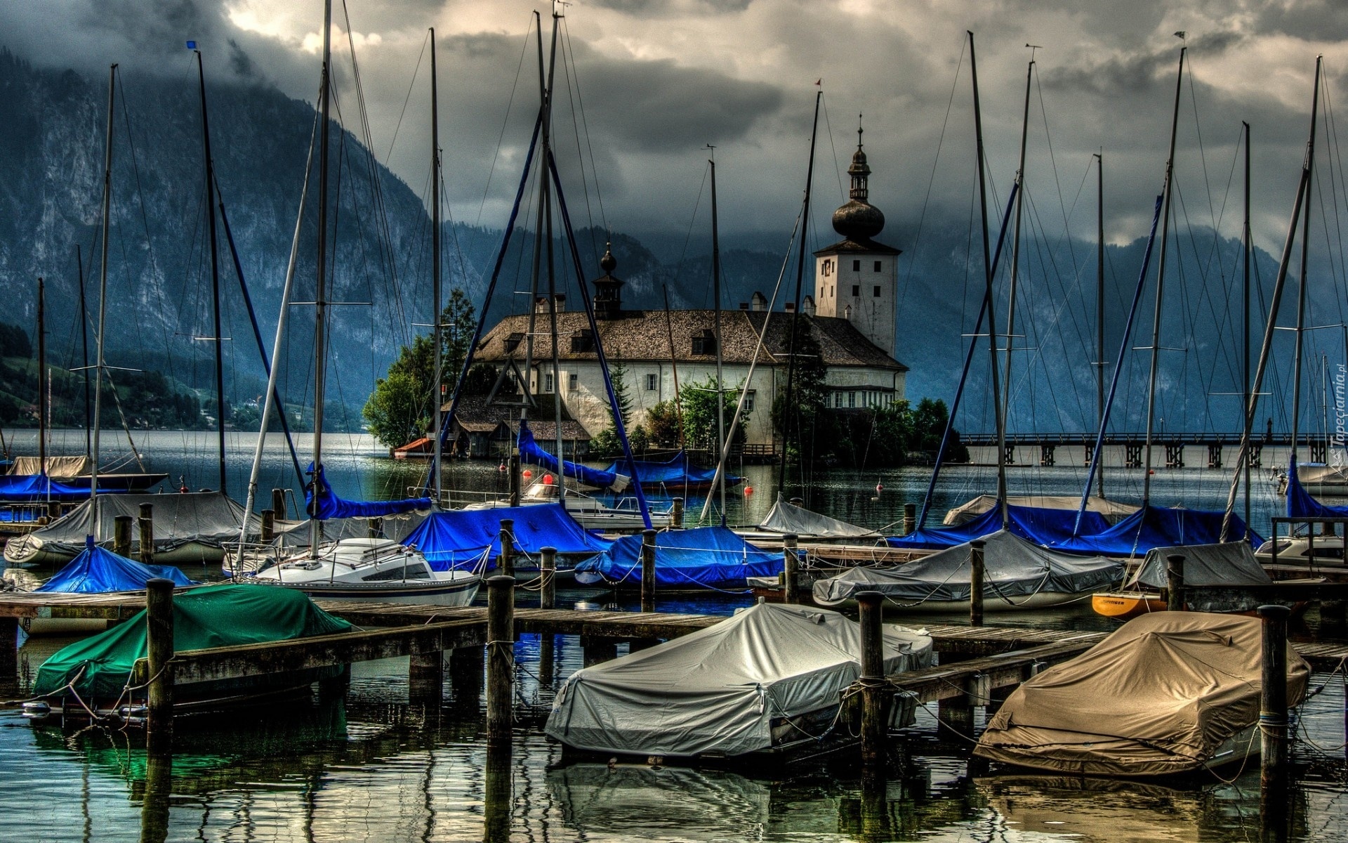 Edytor tapety: Kościół, Góry, Łodzie, Woda