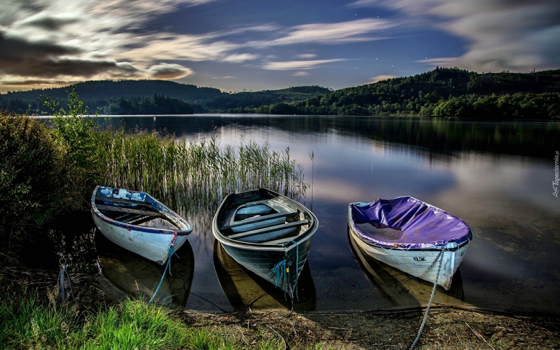 Edytor tapety: Jezioro, Wzgórza, Łódki, Trzcina