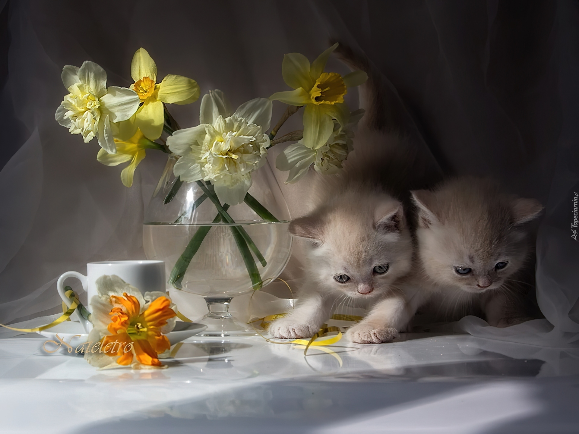 Edytor tapety: Dwa, Kotki, Żonkile, Wazon, Filiżanka