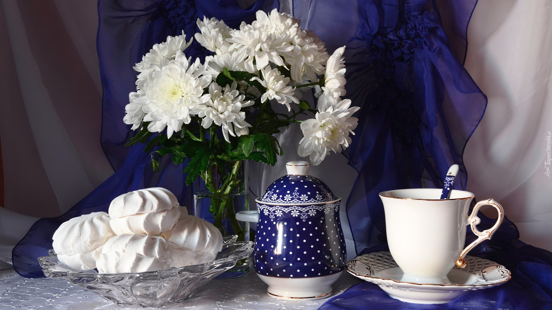 Edytor tapety: Białe, Chryzantemy, Filiżanka, Bezy