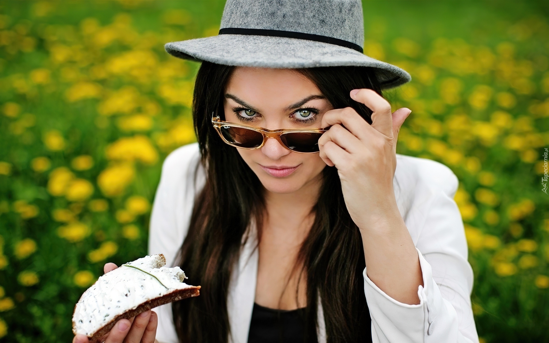 Edytor tapety: Kobieta, Kapelusz, Ciemne, Okulary, Kanapka