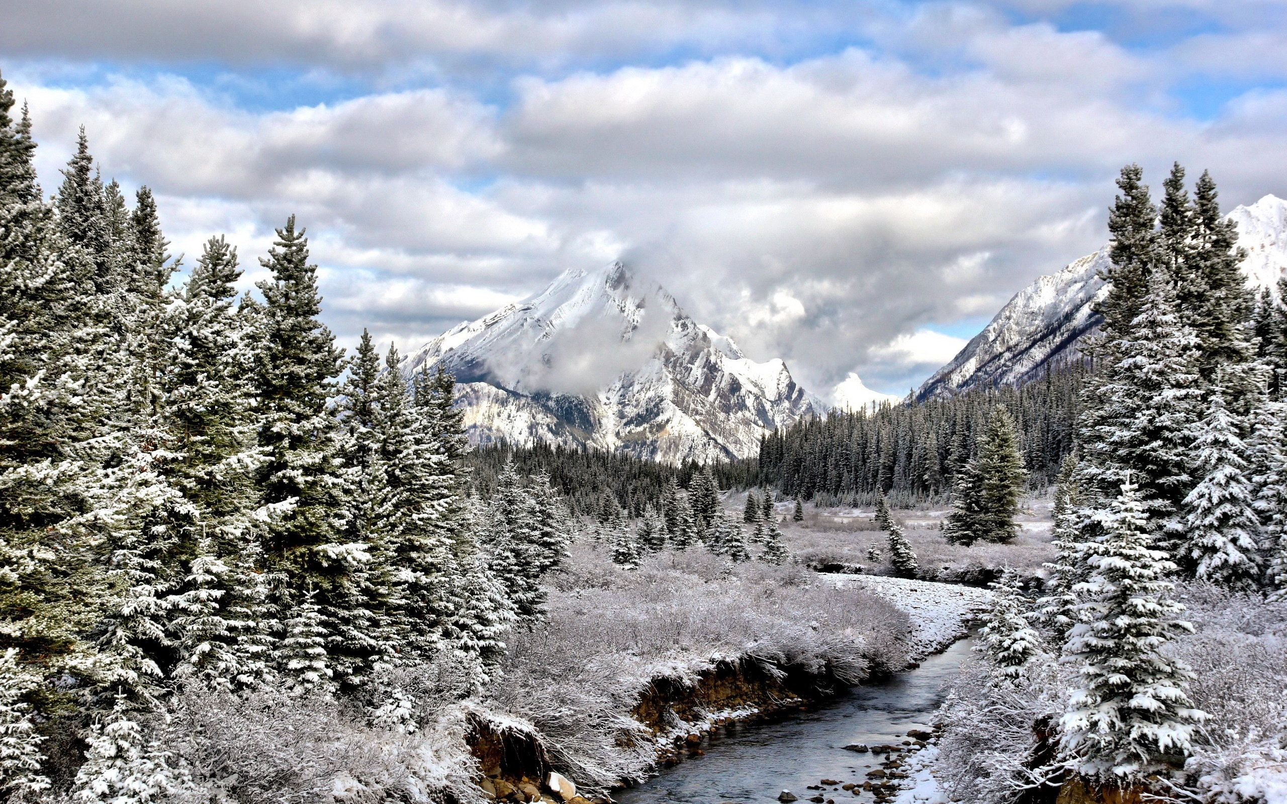 Edytor tapety: Śnieg, Świerki, Strumyk, Góra