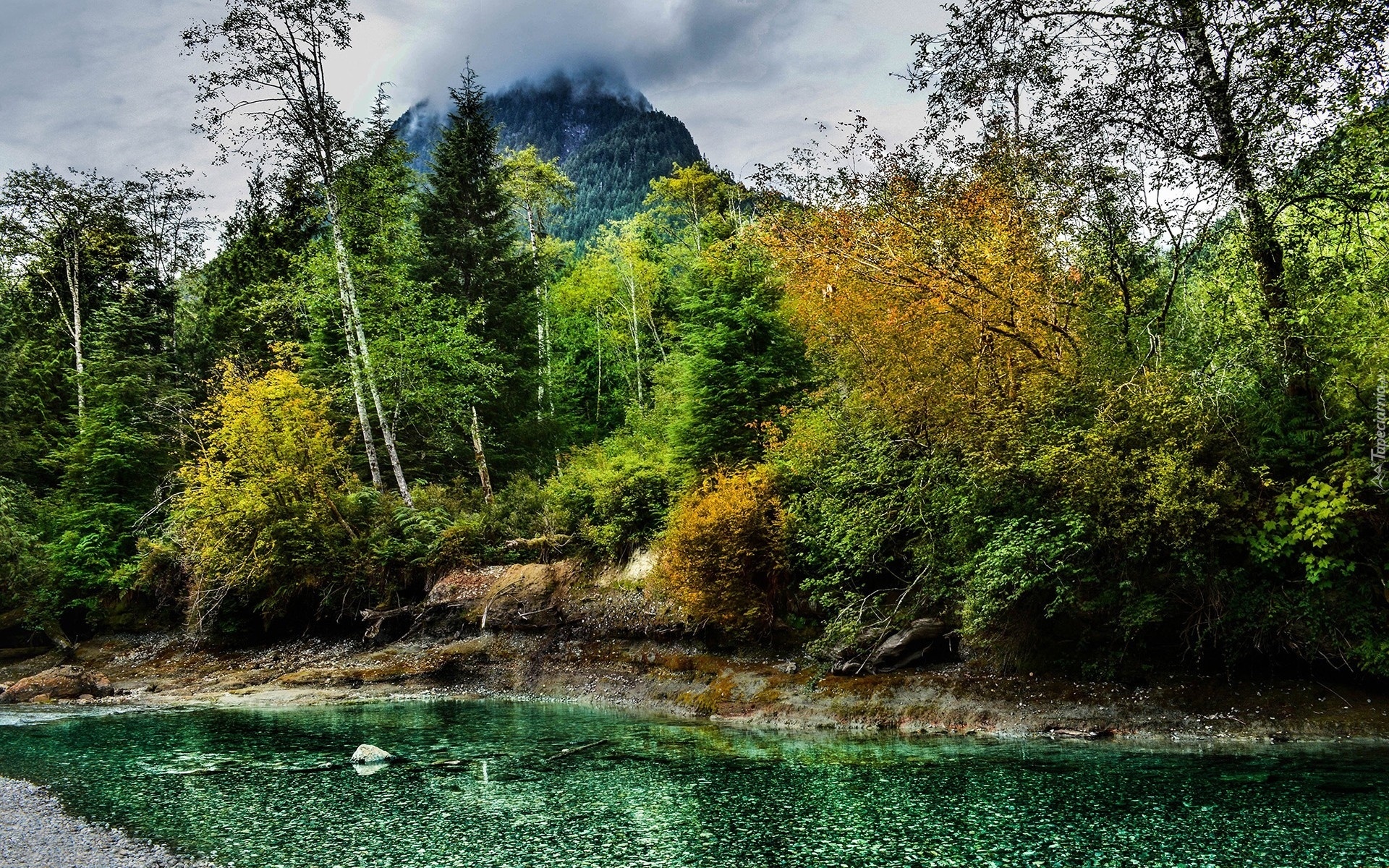 Edytor tapety: Rzeka, Drzewa, Góra, Mgła