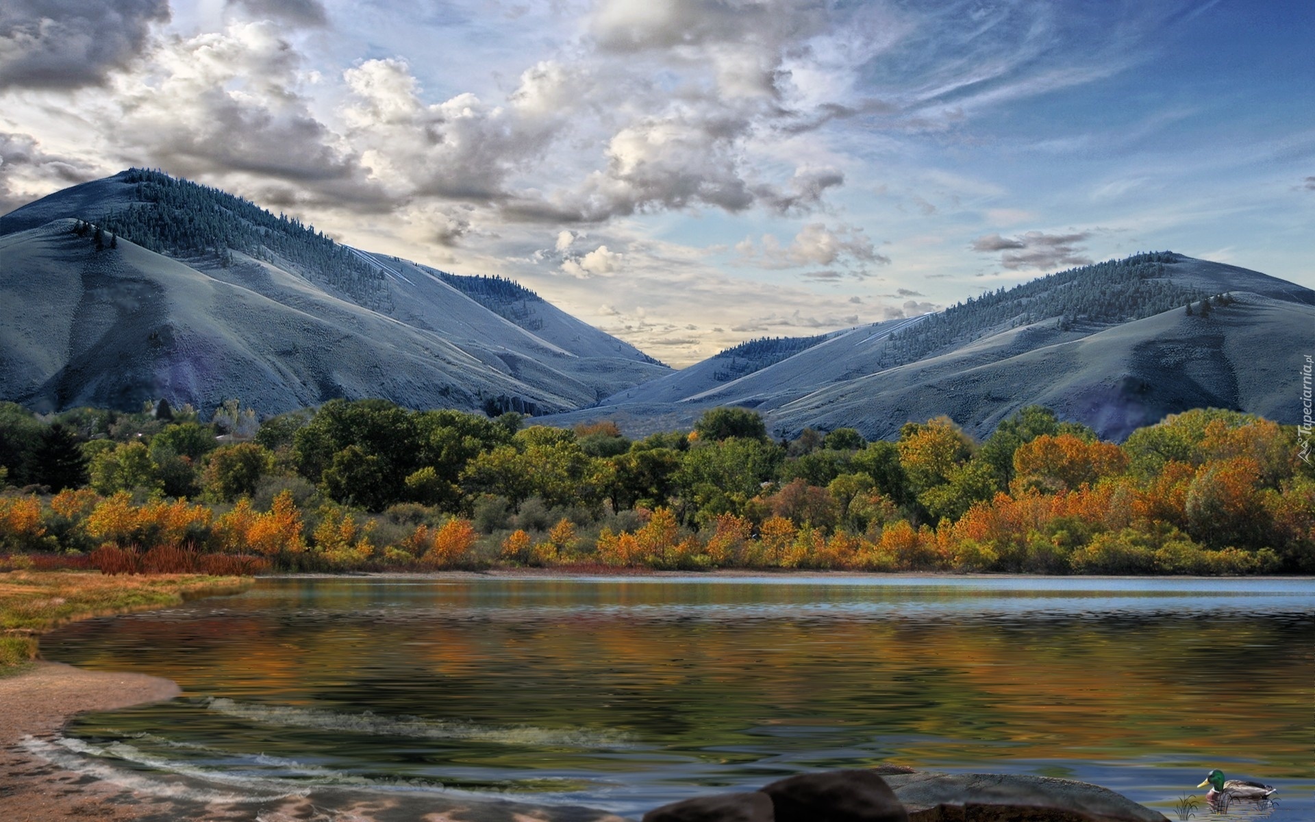 Edytor tapety: Góry, Śnieg, Jezioro, Kaczka, Drzewa