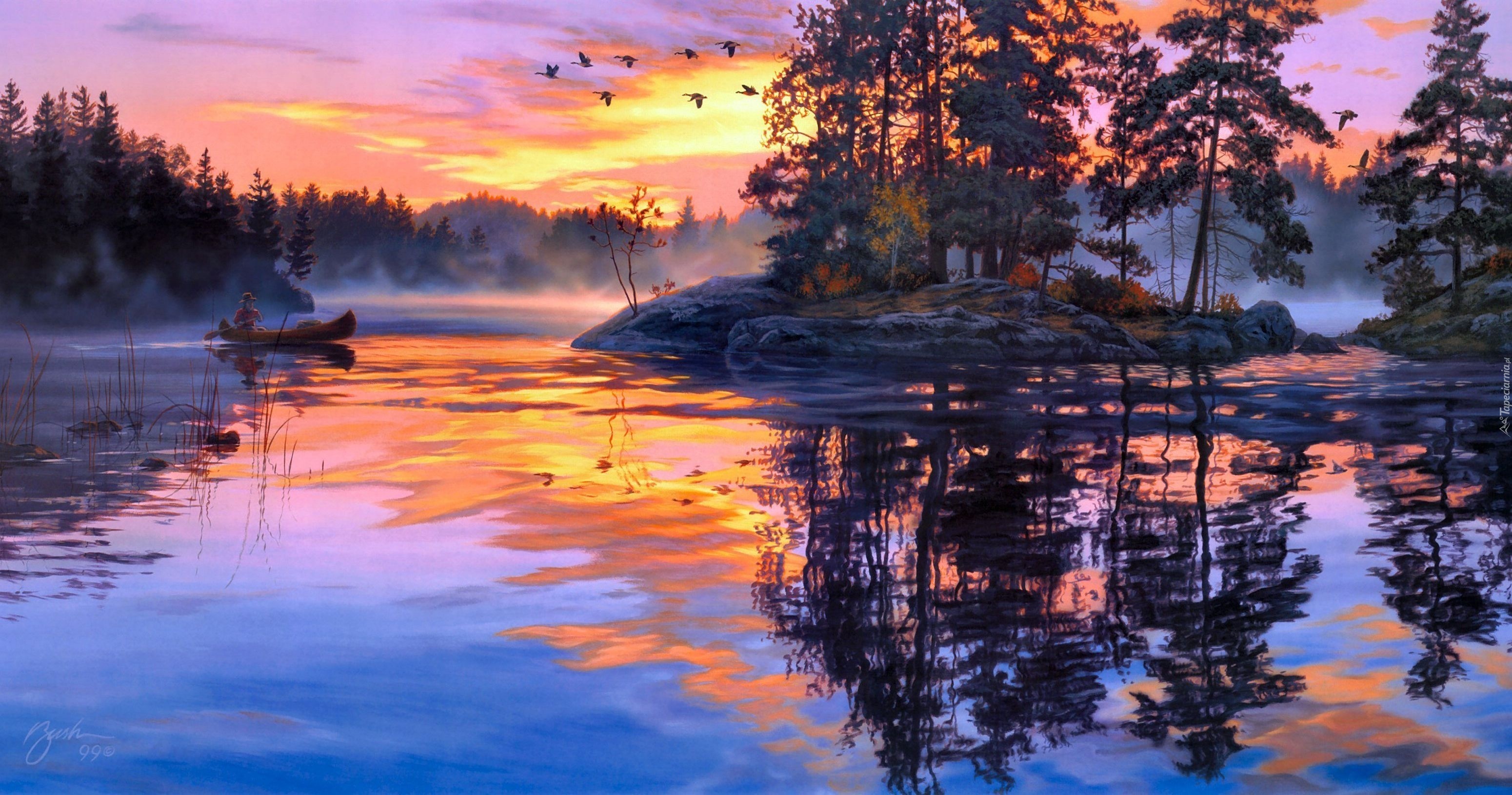 Edytor tapety: Zachód, Słońca, Jezioro, Mgła, Drzewa, Odbicie