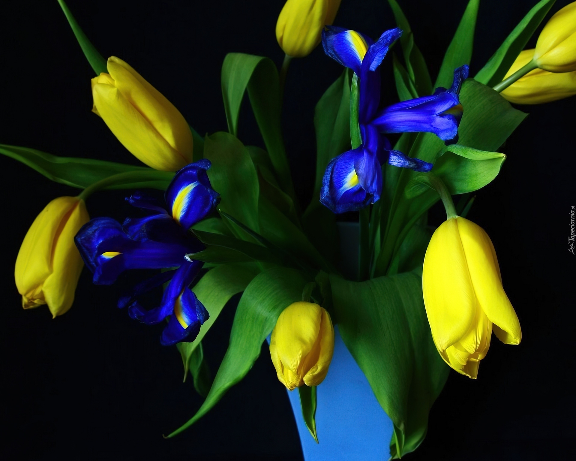 Edytor tapety: Żółte, Tulipany, Irysy, Niebieski, Wazon
