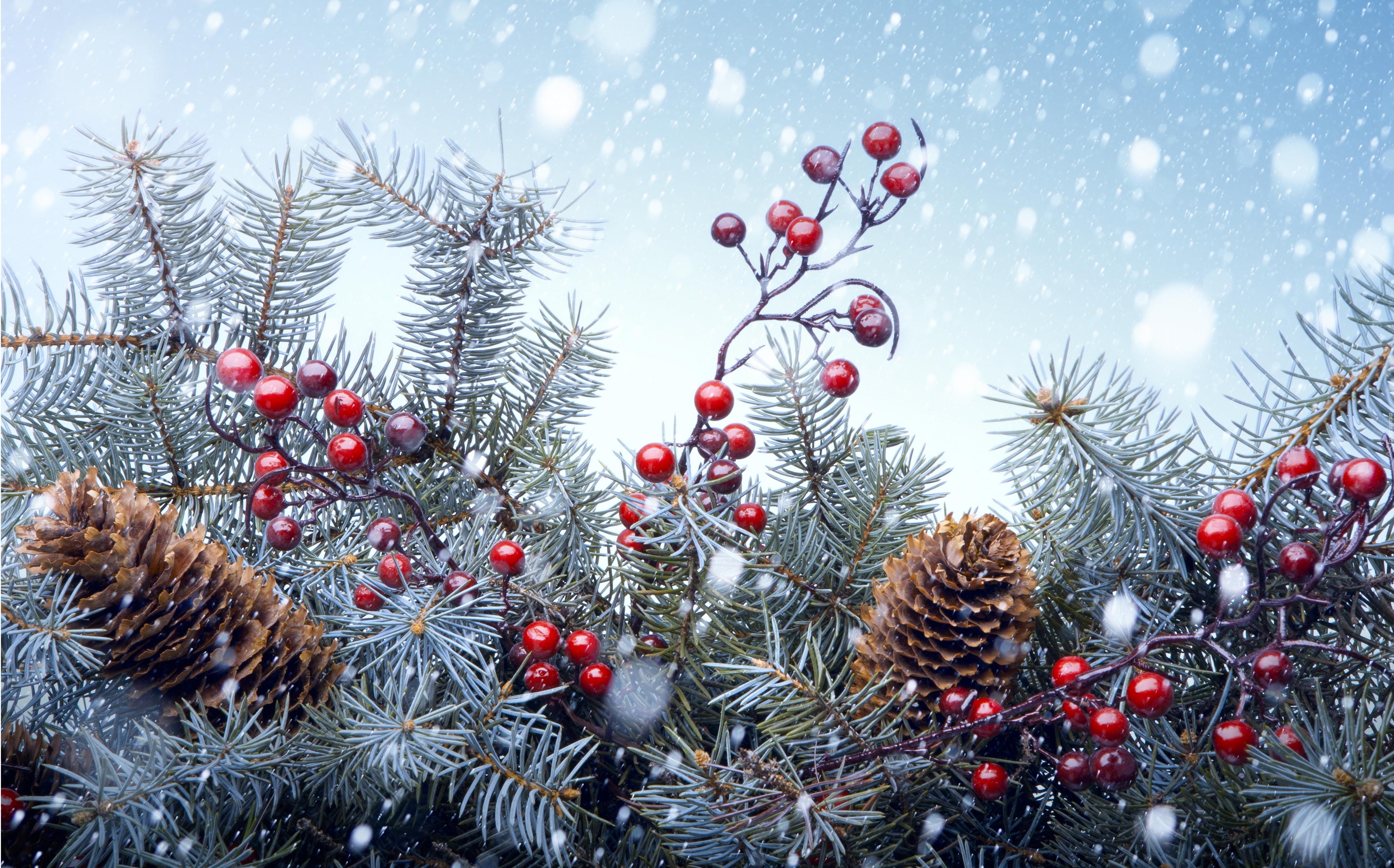 Edytor tapety: Gałązki Świerku, Szyszki, Czerwone, Kulki, Śnieg