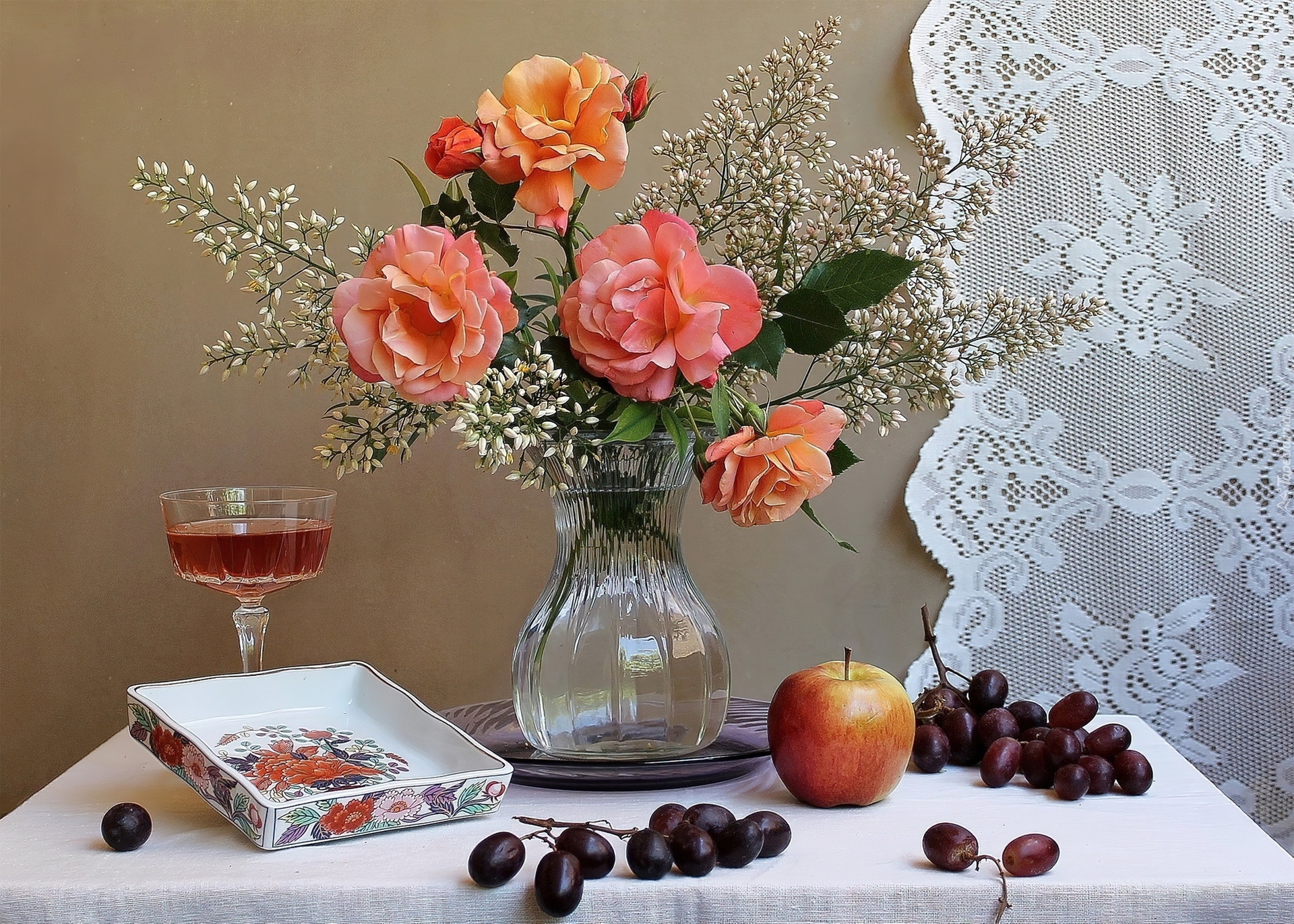 Edytor tapety: Kompozycja, Róże, Jabłko, Winogrona, Kieliszek