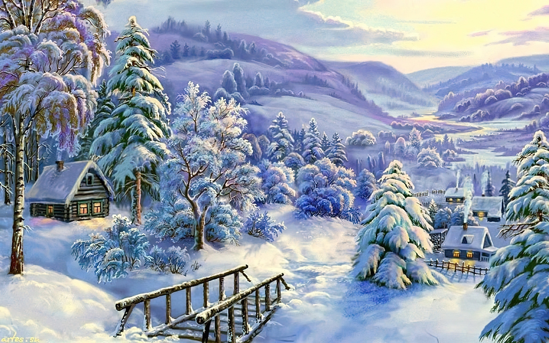 Edytor tapety: Ośnieżone, Drzewa, Domek, Góry, Mostek