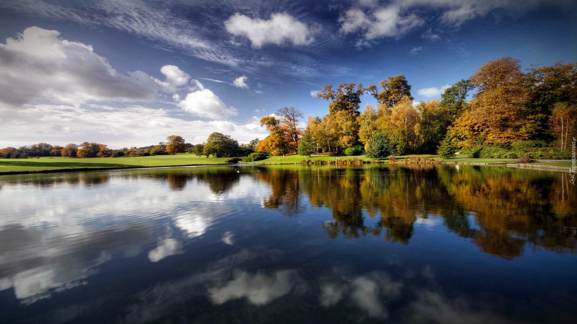 Edytor tapety: Jezioro, Las, Łąka, Obłoki, Odbicie