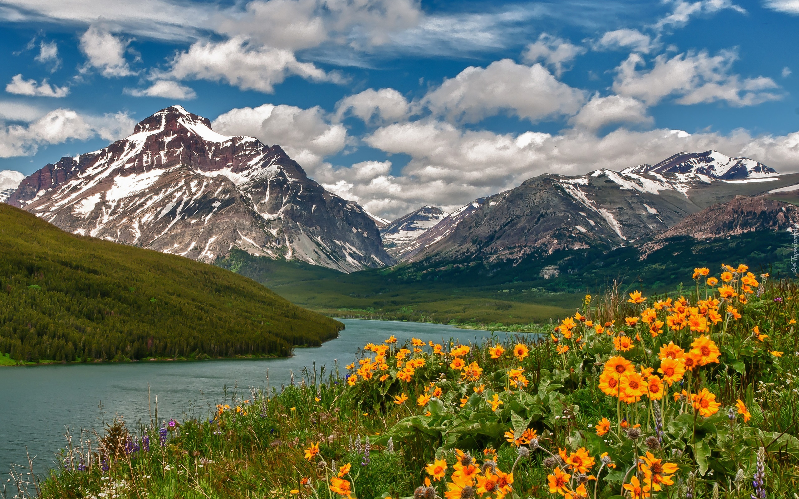 Edytor tapety: Rzeka, Góry, Kwiatki