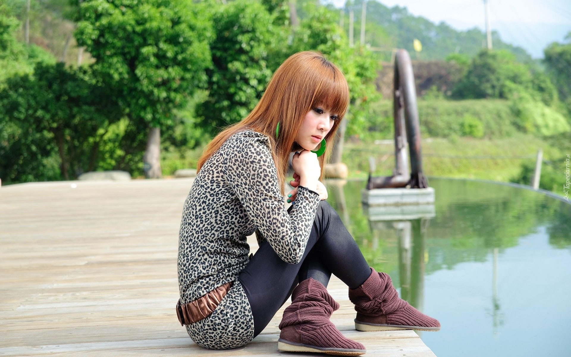 Edytor tapety: Dziewczyna, Zamyślona, Molo, Jeziorko
