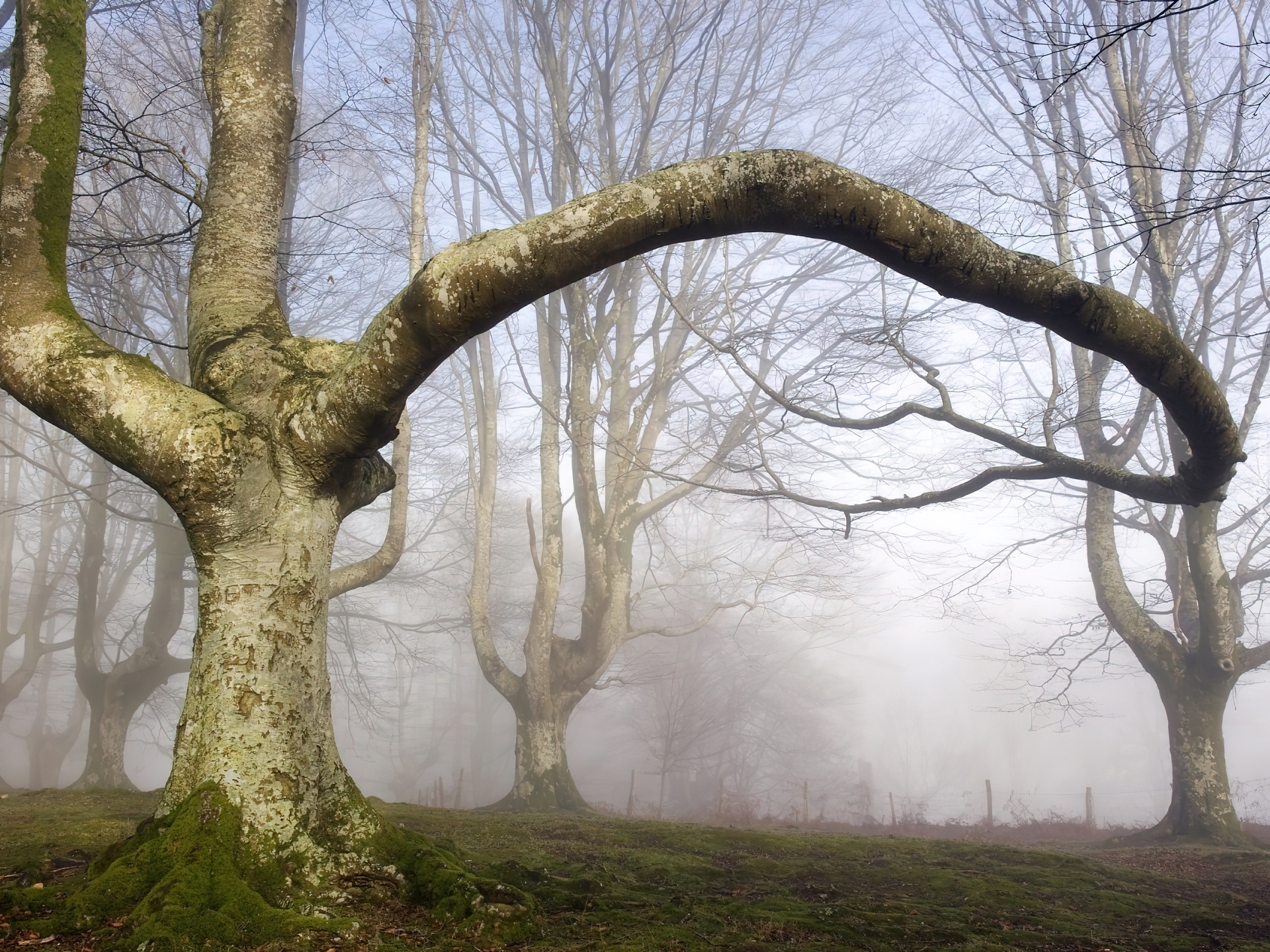Edytor tapety: Drzewa, Pochyły, Konar, Mgła, Mech