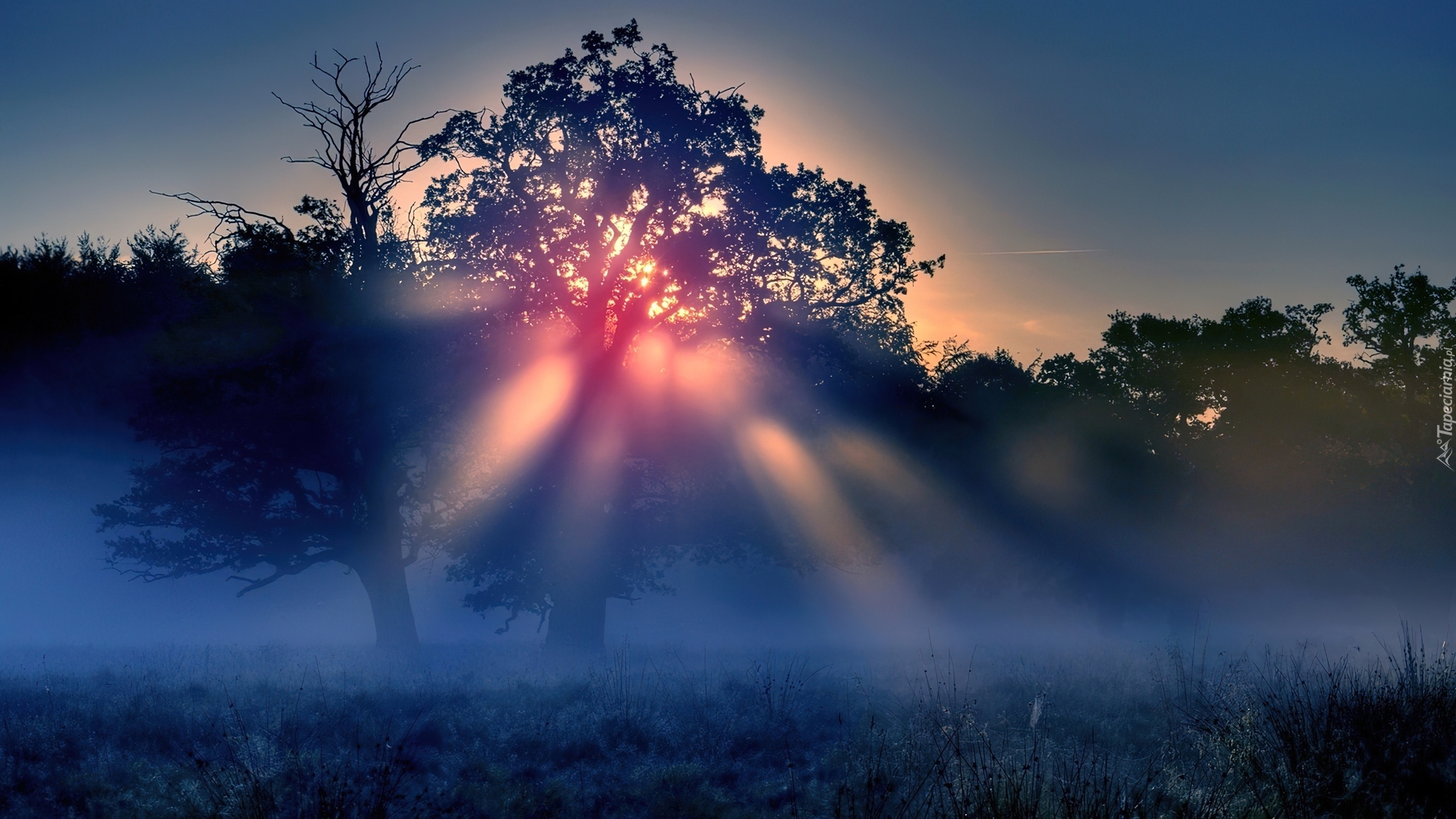 Edytor tapety: Drzewa, Mgła, Wieczór, Zachód, Słońca, Przebijające, Promienie