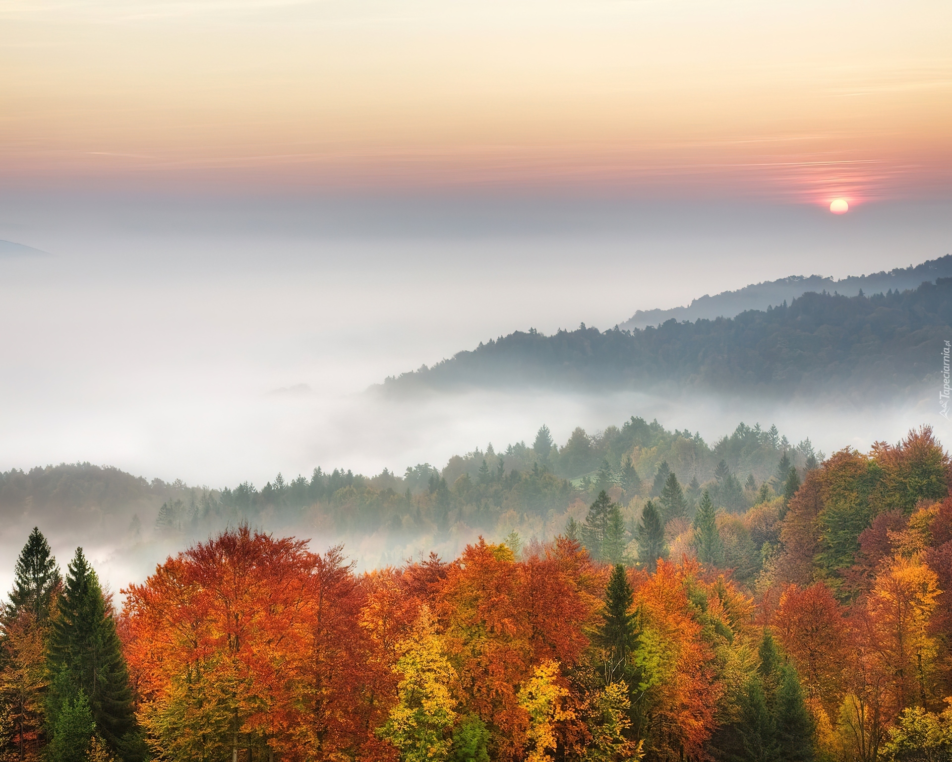 Edytor tapety: Jesień, Góry, Mgła, Zachód, Słońca, Drzewa