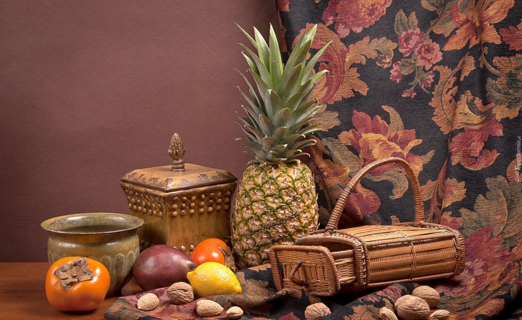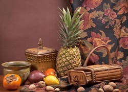 Edytor tapety: Kompozycja, Ananas, Cytryna, Orzechy, Koszyk, Naczynia