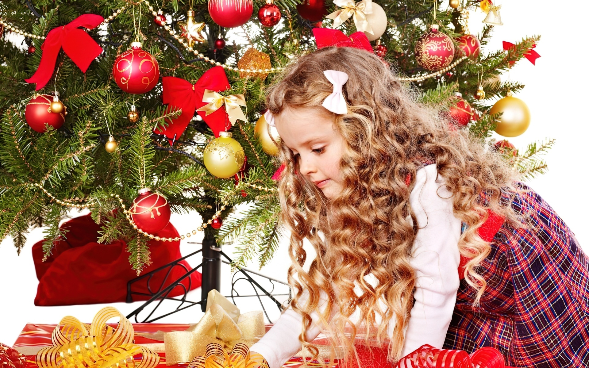Edytor tapety: Dziewczynka, Boże, Narodzenie, Ustrojona, Choinka, Prezenty