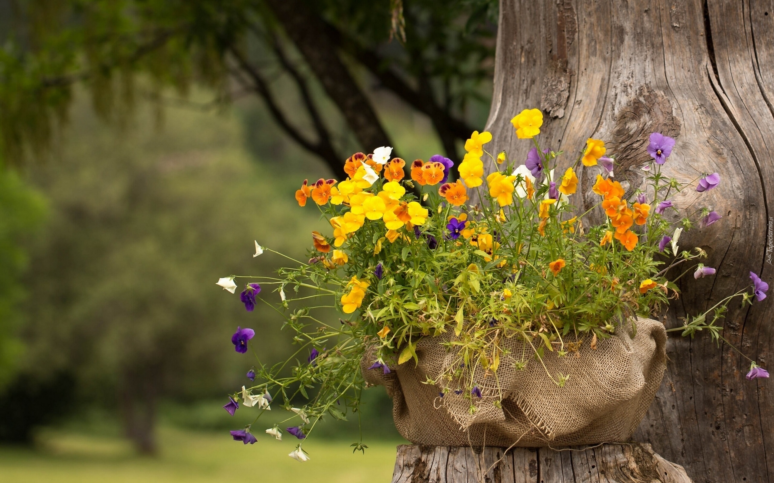 Edytor tapety: Kosz, Bratków, Pień, Drzewa, Park