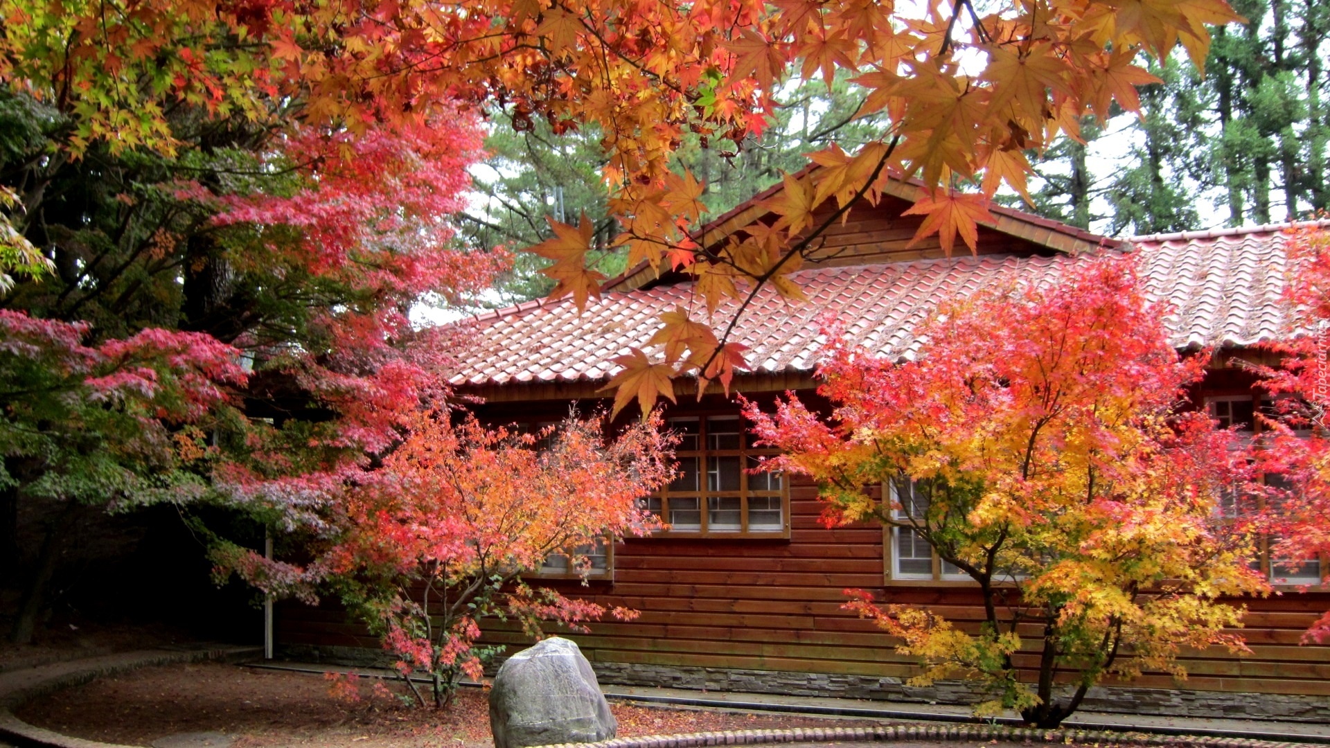 Edytor tapety: Drzewa, Kolorowe, Liście, Głaz, Domek