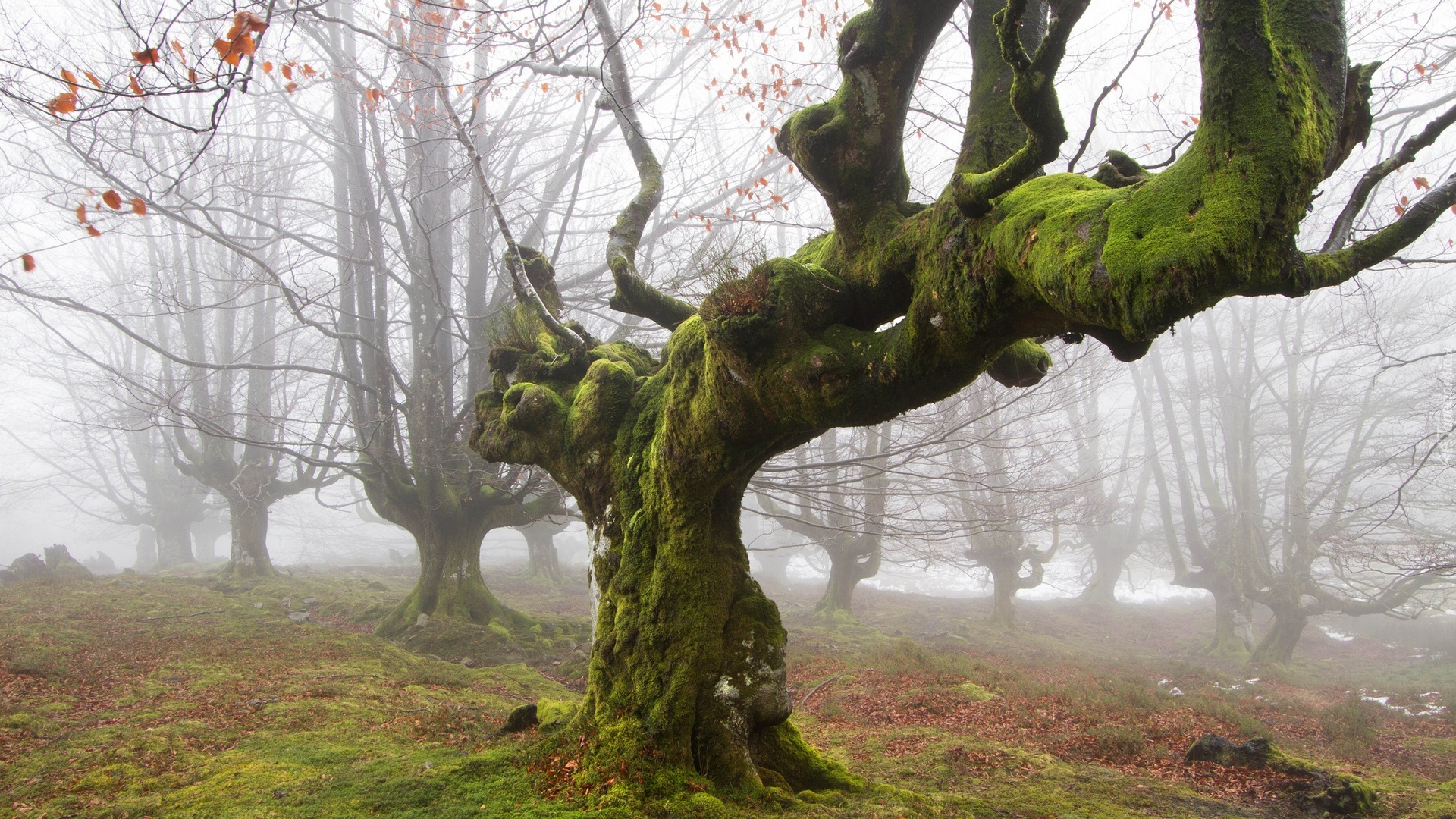 Edytor tapety: Jesień, Mgła, Stare, Krzywe, Drzewo, Liście, Mech