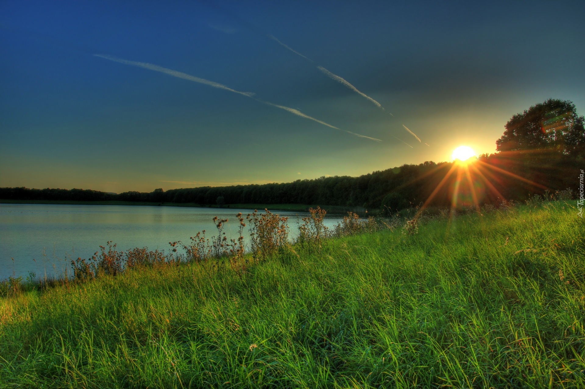 Edytor tapety: Wieczór, Zachód, Promienie, Słońca, Trawa, Jezioro, Drzewa