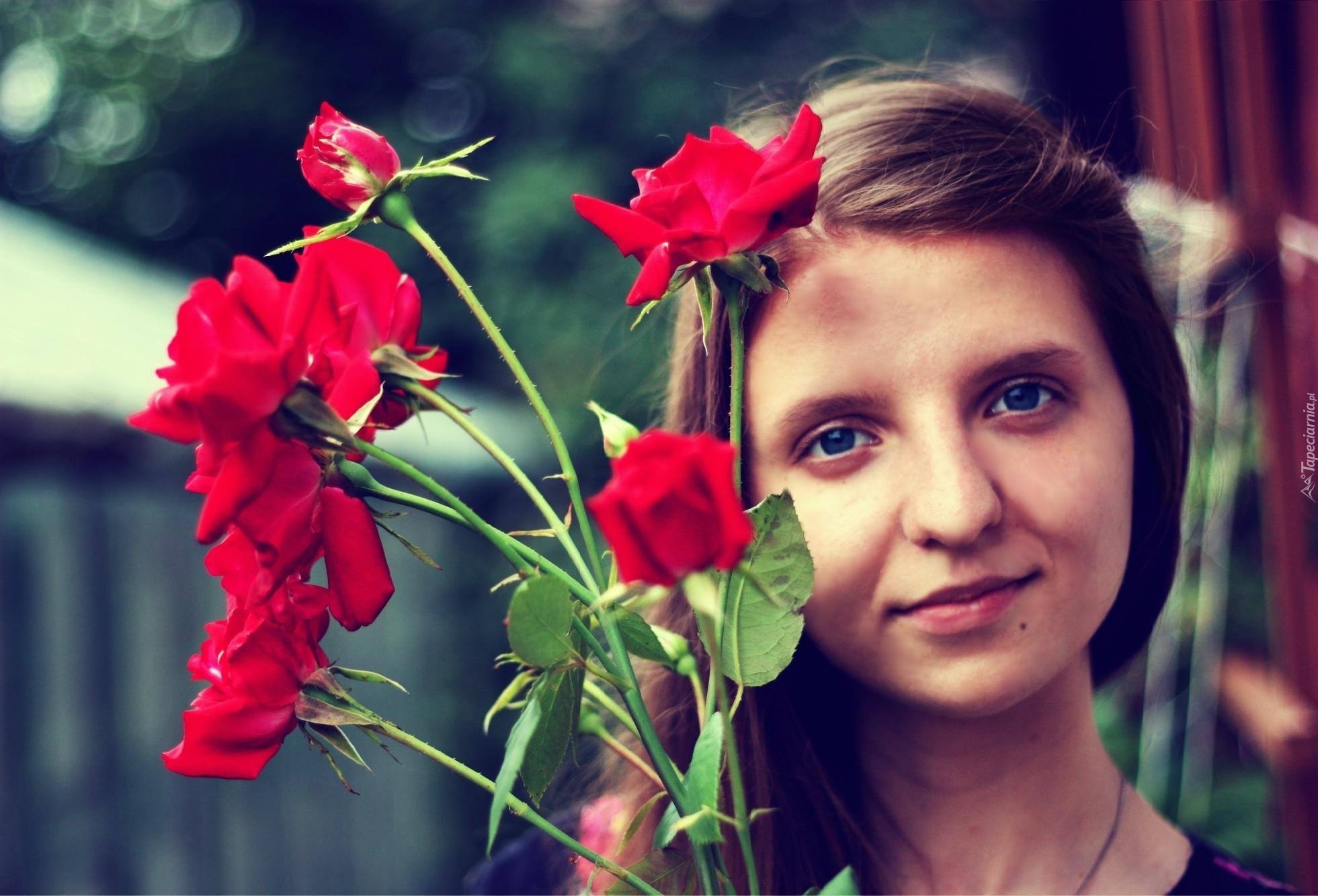 Edytor tapety: Kobieta, Niebieskie, Oczy, Czerwone, Kwiaty