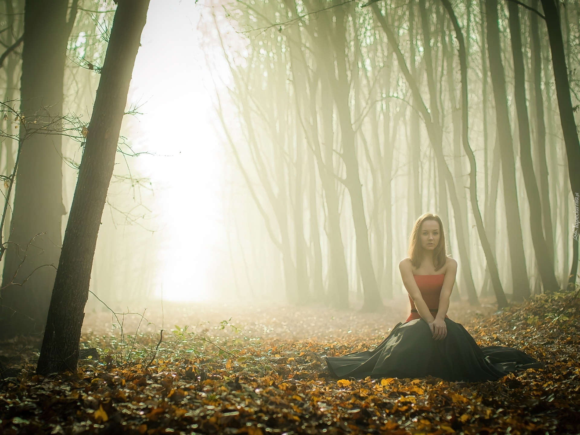 Edytor tapety: Jesień, Mgła, Drzewa, Liście, Kobieta, Odpoczynek