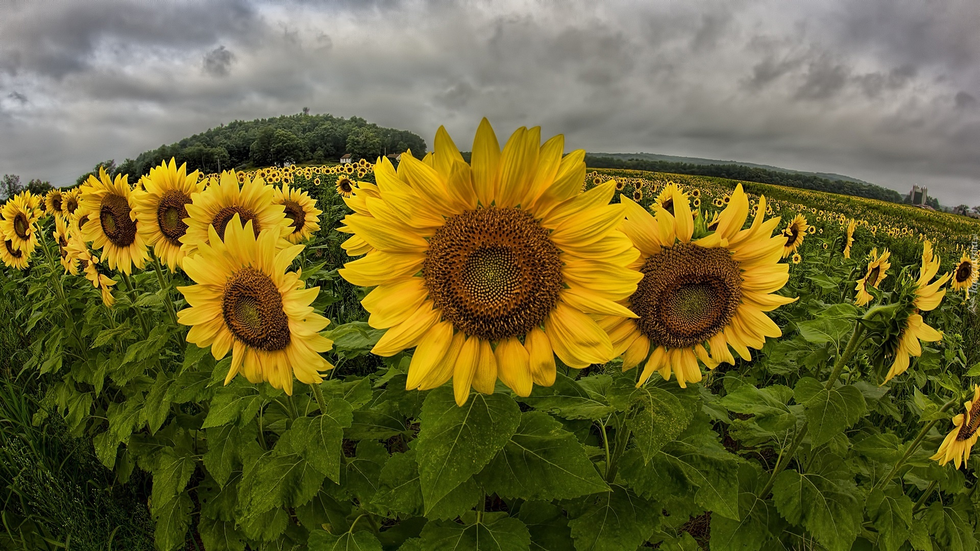 Edytor tapety: Pole, Słoneczników, Chmury, Panorama