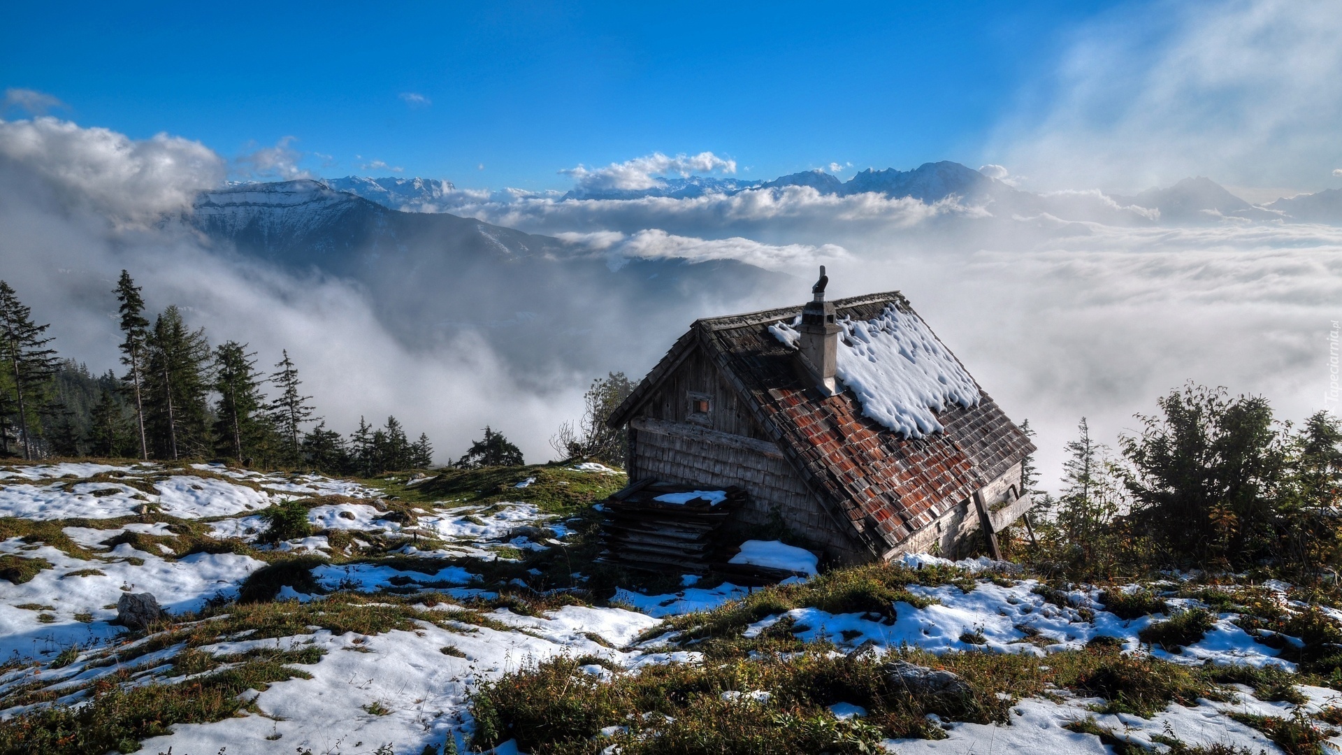 Edytor tapety: Dom, Góry, Lasy, Chmury, Zima