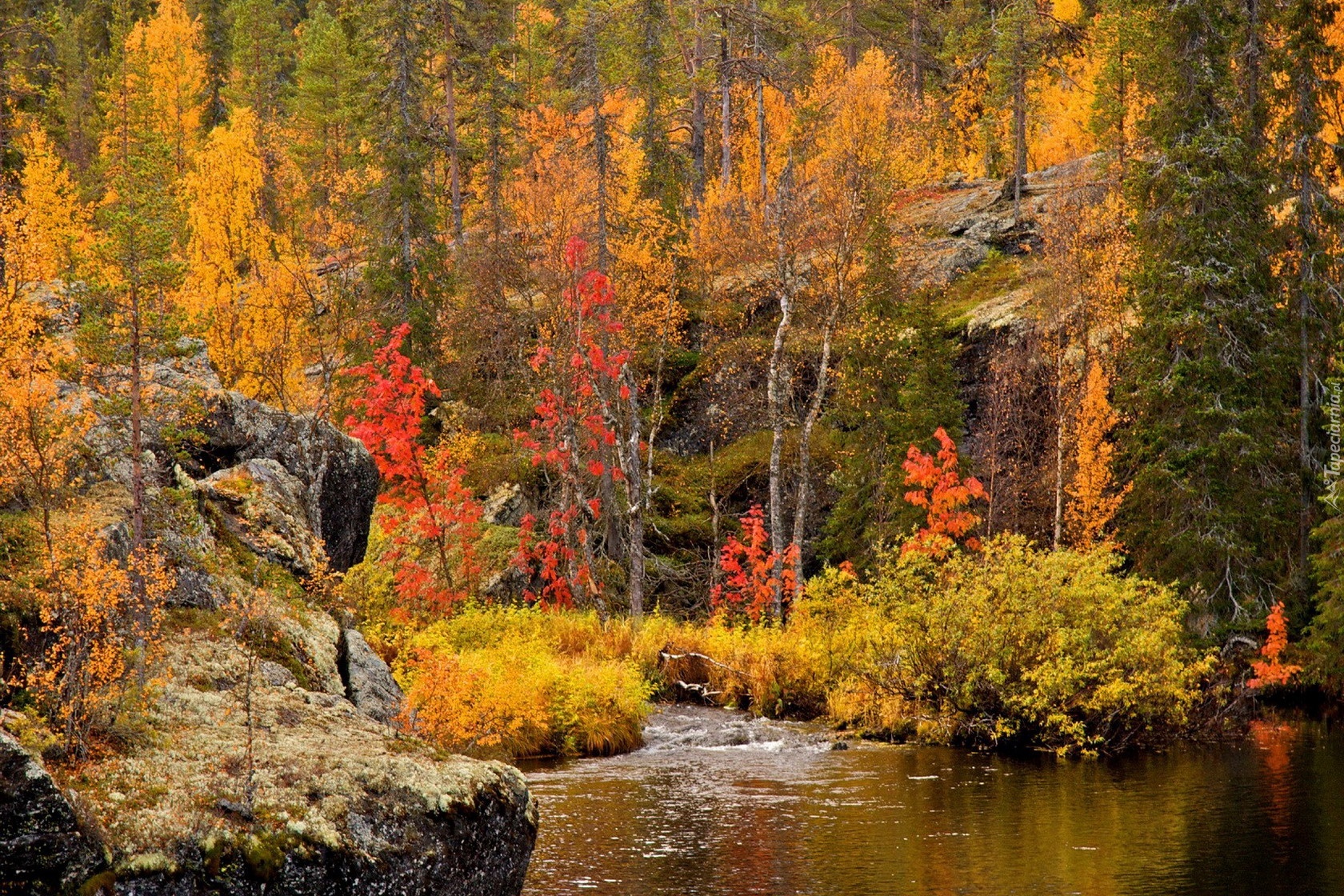 Edytor tapety: Rzeka, Las, Skały, Jesień