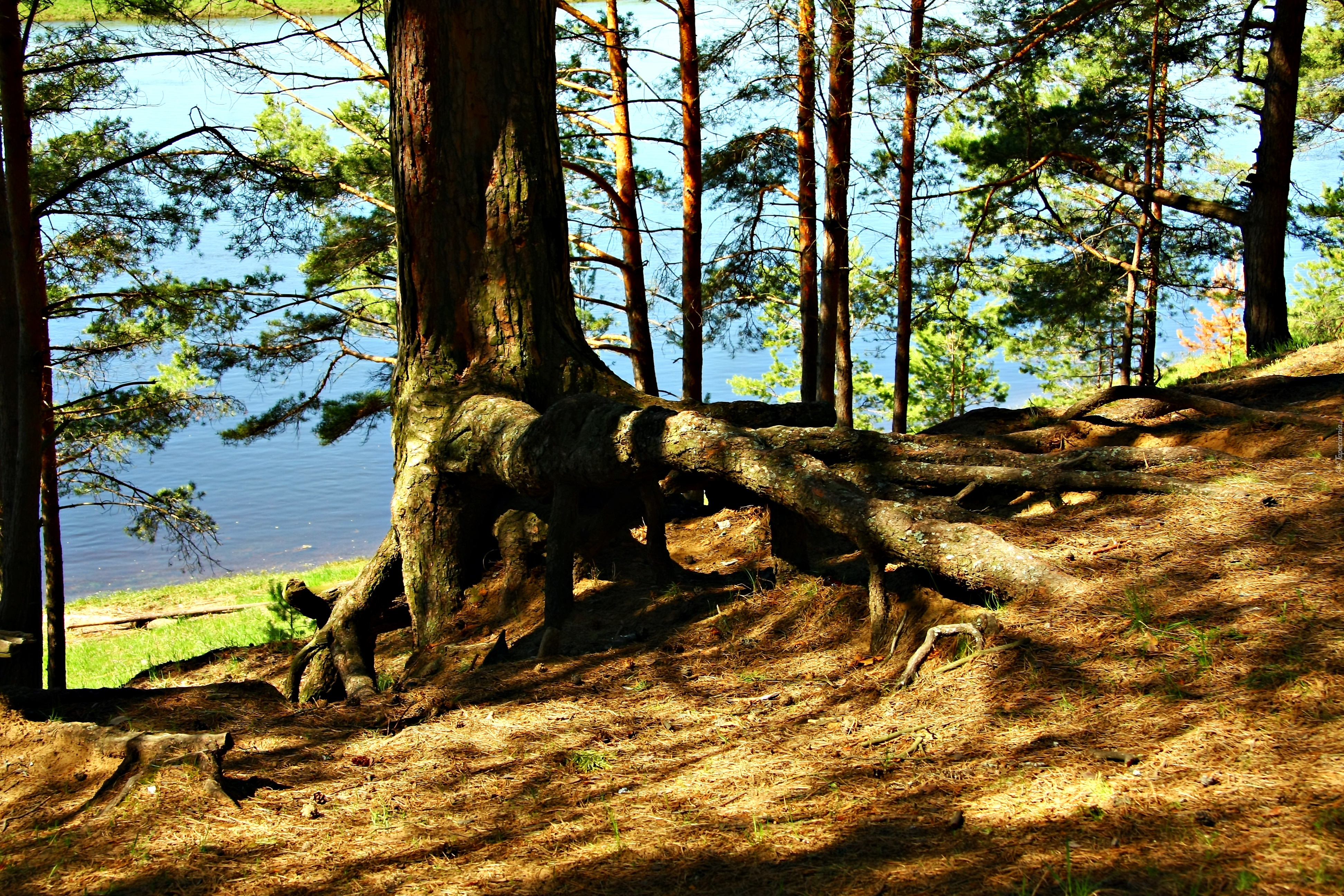Edytor tapety: Rzeka, Brzeg, Drzewa, Sosna, Korzenie