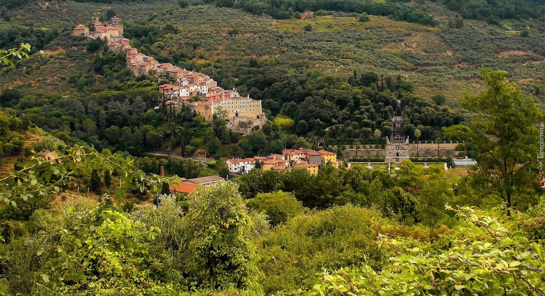 Edytor tapety: Wzgórza, Drzewa, Roślinność, Domy