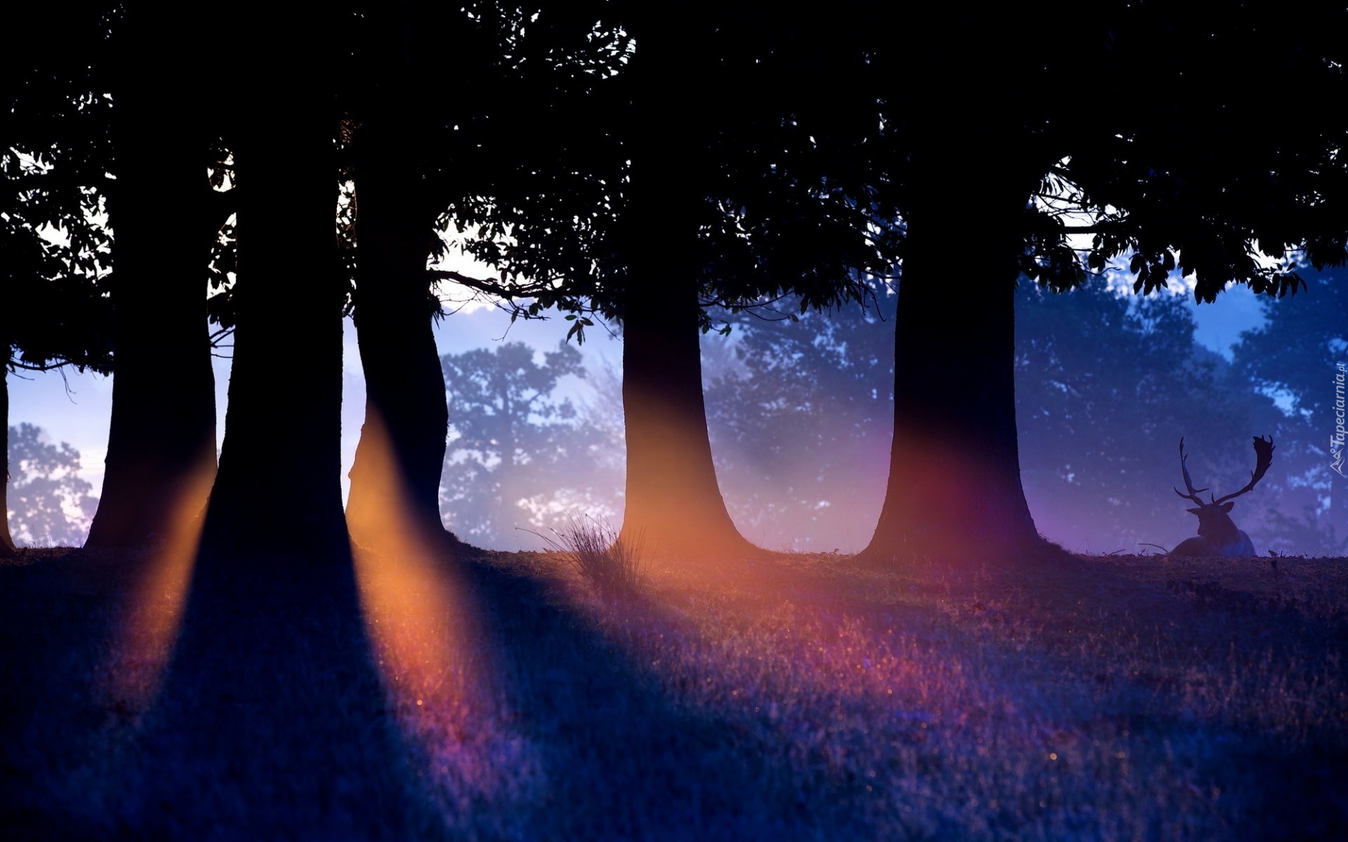 Edytor tapety: Drzewa, Mgła, Przebijające, Światło, Jeleń