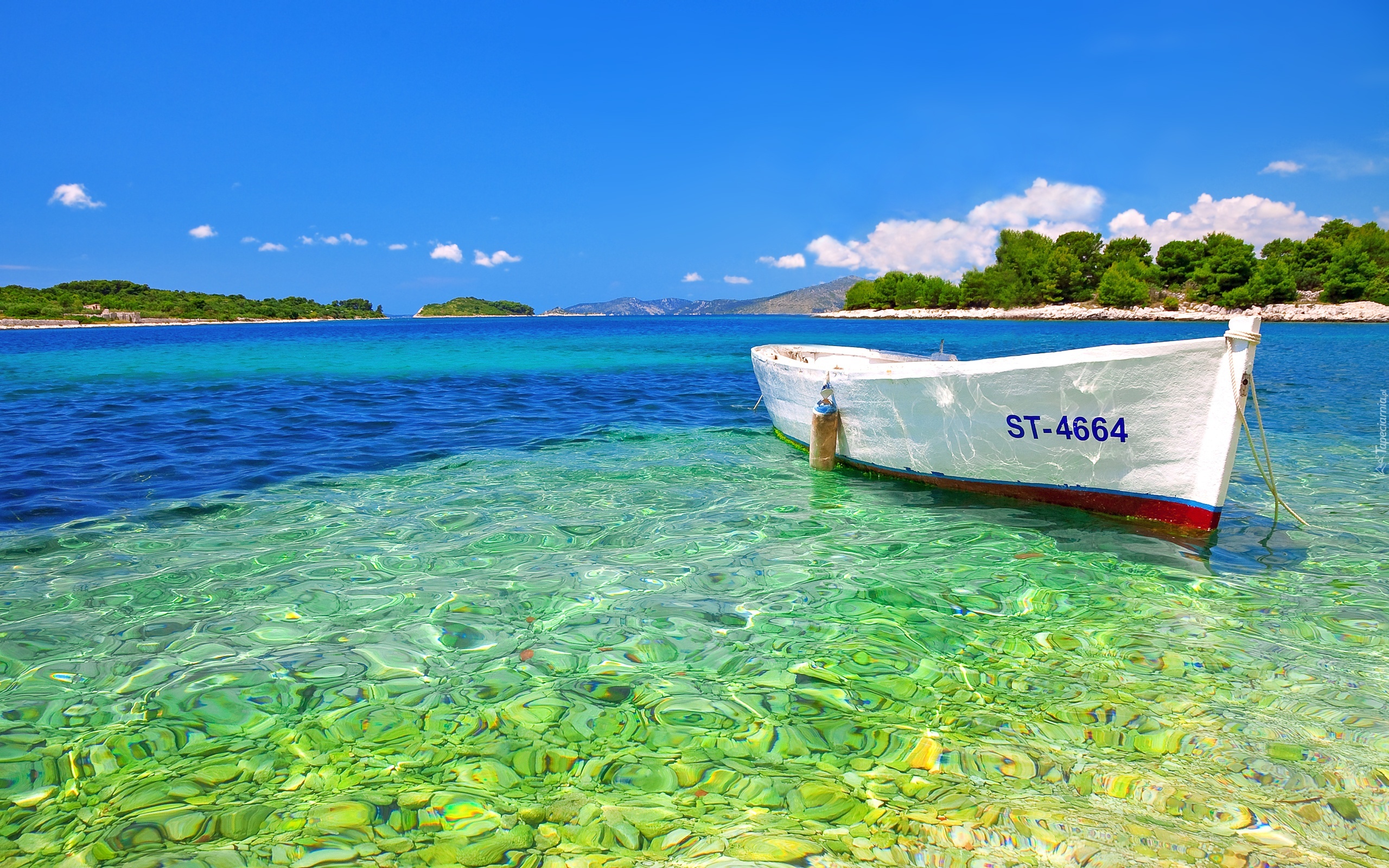 Edytor tapety: Morze, Łódka, Drzewa, Niebo