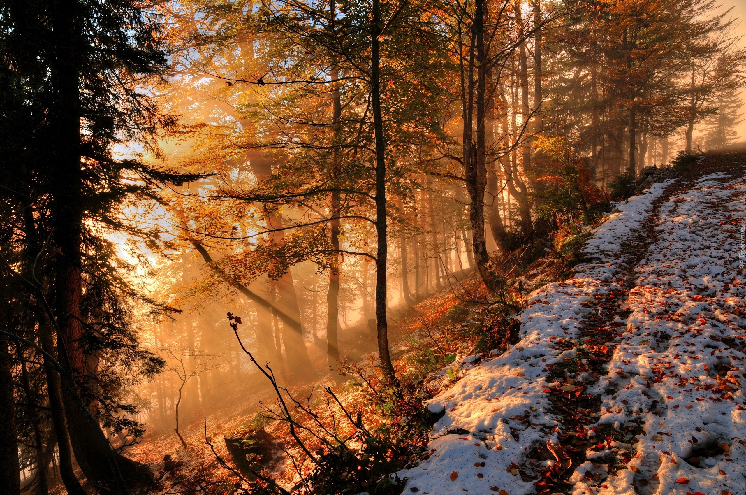 Edytor tapety: Las, Śnieg, Promienie, Słońca