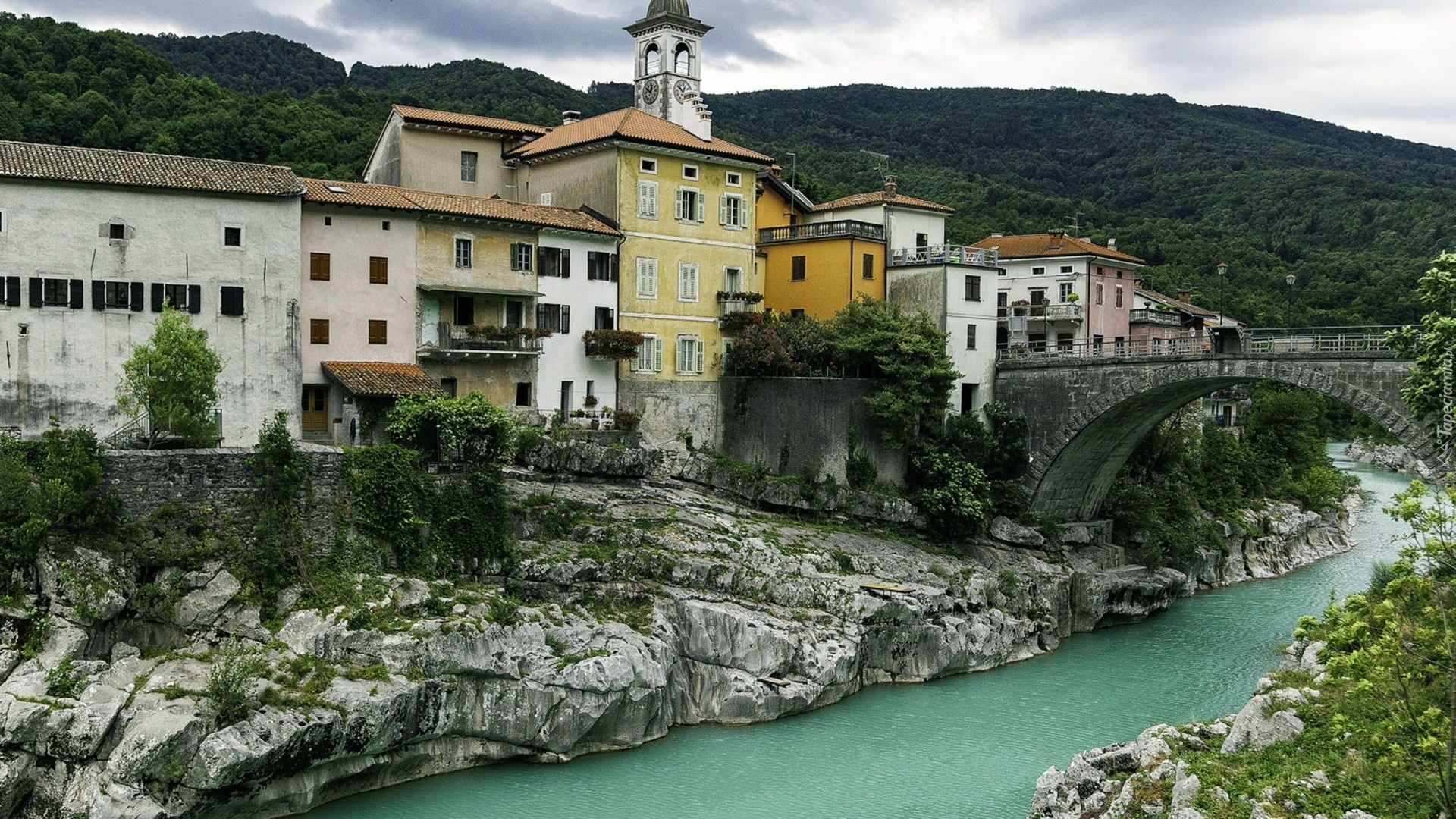 Edytor tapety: Triglav, Słowenia, Most, Domy, Rzeka