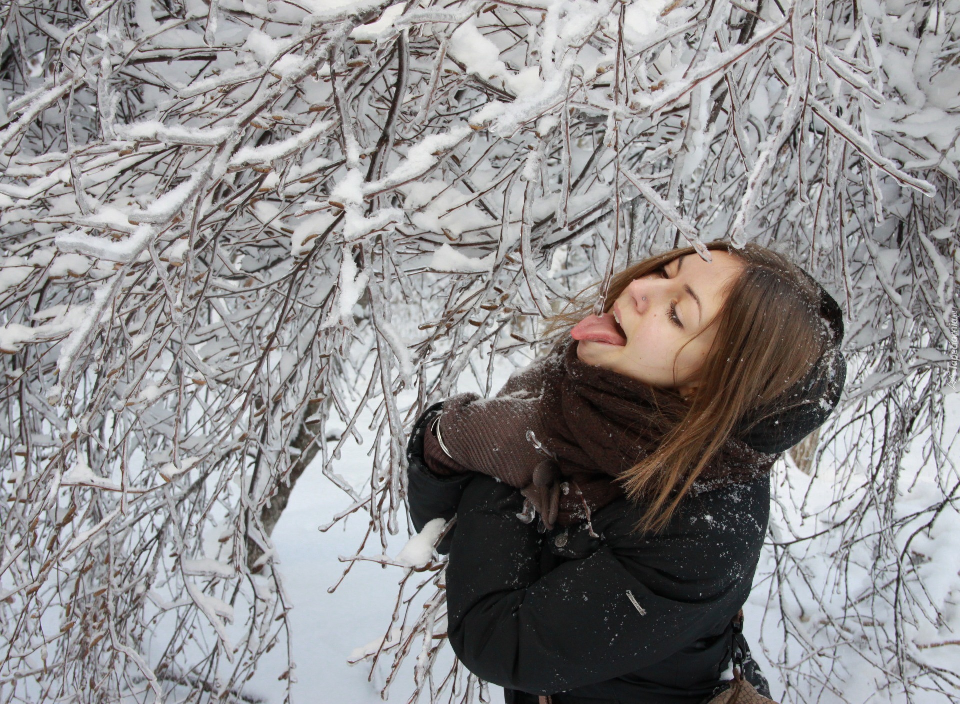 Edytor tapety: Kobieta, Język, Zima, Śnieg, Gałązki