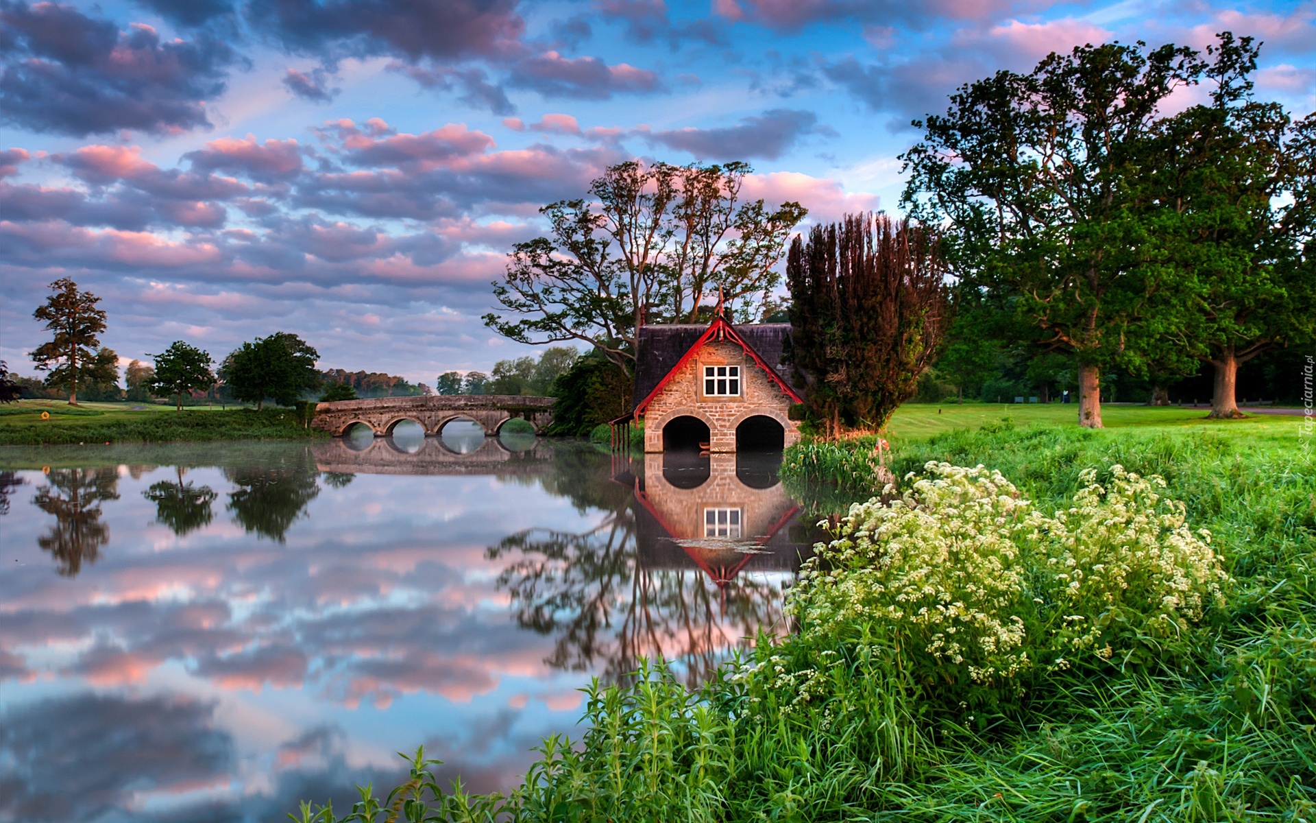 Edytor tapety: Rzeka, Most, Dom, Kwiaty, Park