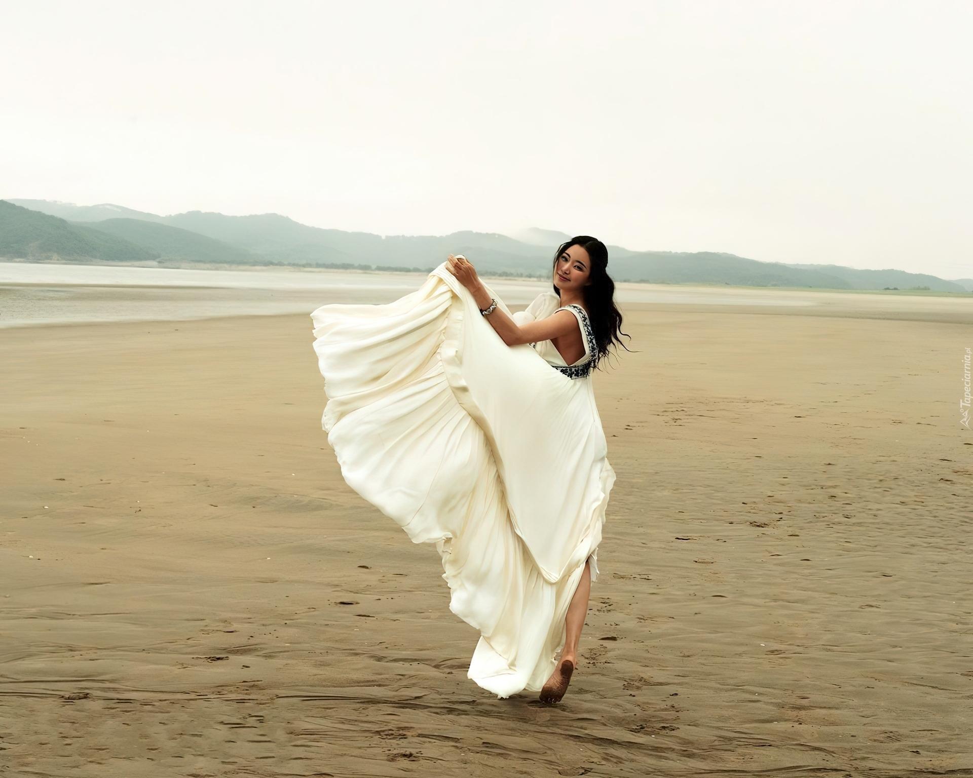 Edytor tapety: Kobieta, Plaża, Biała, Suknia