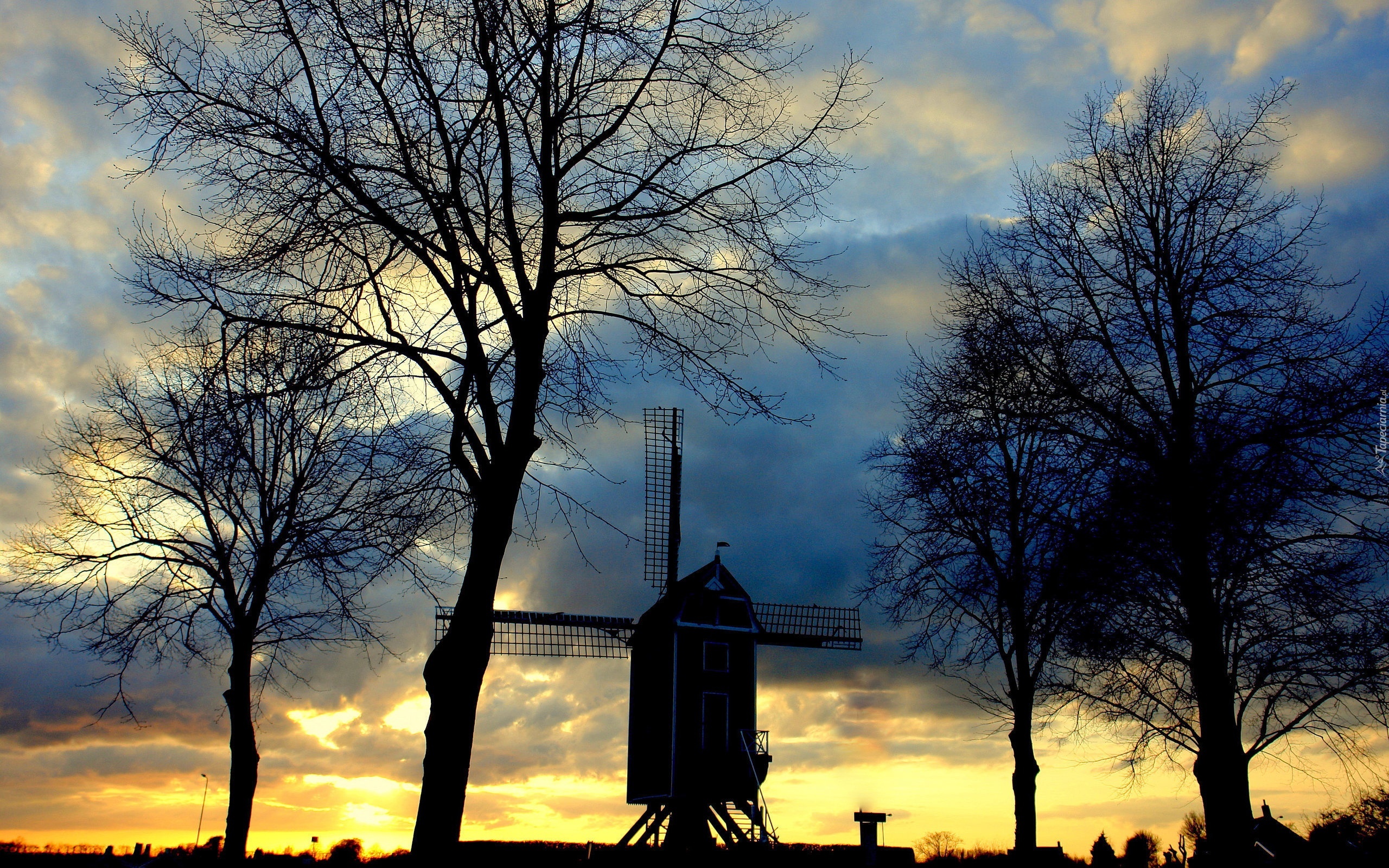 Edytor tapety: Wiatrak, Drzewa, Chmury, Zachód, Słońca, Jesień